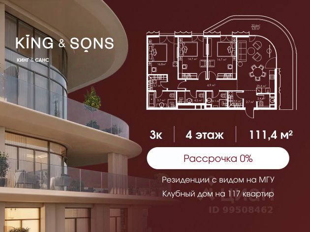 КИНГ энд САНС это клубный дом на 117 резиденций премиум-класса, расположенный на престижной и исторической улице Мосфильмовская. Из большинства квартир открываются панорамные виды на МГУ, "Москву-Сити", особняки посольств и парки. Это место для тех, кто не хочет выбирать между комфортом мегаполиса и уединением на природе. Проект разработан международным архитектурным бюро, которое входит в ТОП-2 в мире. Фасады из натурального камня, мягкие формы здания, максимально открытое остекление, окна в пол — все это делает облик здания выразительным и уникальным. В проекте предусмотрено 70% квартир с террасами. Потолки от 3,2 до 4,7 м. Паркинг на 110 машиномест. Для будущих резидентов продуманы разнообразные общественные пространства зимний сад в лобби первого этажа, секретный сад с зоной открытого огня, лаундж-зона с кинотеатром на крыше, собственный спортзал, зоны для занятий йогой и медитацией. КИНГ энд САНС это фамильная недвижимость, которую с гордостью передают по наследству