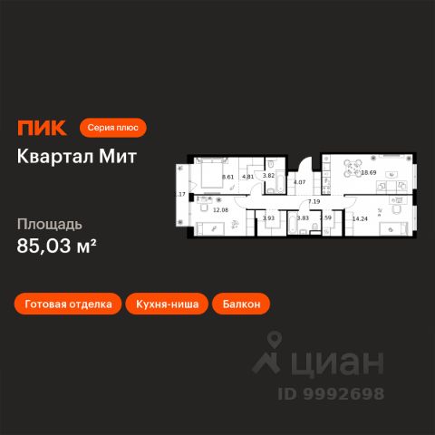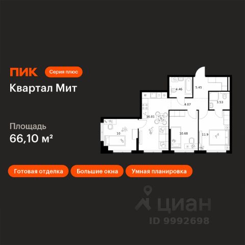 Продаётся 3-комн. квартира площадью 69,3 кв.м на 17 этаже 26 этажного дома (Корпус 3.2, Секция 2) проекта ПИК Квартал Мит. Светлый просторный подъезд на уровне земли, функциональная планировка, большие окна, c отделкой. "Квартал Мит" строится в экологически чистом районе Митино, где по соседству расположен большой лесопарк, а с двух сторон протекают реки Сходня и Журавка. Для семей с детьми здесь появится школа и два детских сада. В 20 минутах пешком находится станция метро "Пятницкое шоссе", а за 10 минут на автомобиле можно доехать до МКАД. Архитектура от архитектурного бюро "Слава+" Концепция квартала сочетает эстетику и функциональность. Башня-доминанта цвета красной охры и разновысотные корпуса терракотового, белого и графитового оттенков формируют узнаваемый силуэт современного городского пространства. Просторные террасы, разнообразные балконы и окна в пол придают облику динамичность и дарят квартирам уютные места для отдыха. Первые этажи с панорамными окнами создают сцену для яркой городской жизни. Здесь появятся пространства для прогулок, летние террасы, рестораны и коммерческие помещения. Комфорт "Серии плюс". При входе в дом жителей встретят светлые просторные лобби с высокими потолками — попасть сюда можно как со стороны улицы, так и со двора. В лобби будет зона ожидания, велосипедная и колясочная. Быстро и с комфортом подняться на нужный этаж помогут бесшумные скоростные лифты. На подземном этаже появится паркинг и индивидуальные кладовые, где удобно хранить сезонные вещи. Артикул 1034302 (Застройщик АО СЗ "ПФК")