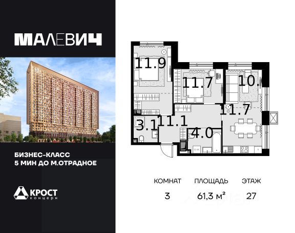 Продаётся 3-к квартира 60.6 кв.м. на 9-м этаже 28 этажного дома. Без отделки. Срок сдачи: 1 кв. 2026 г. Дом МАЛЕВИЧ - это идеальный проект мультифункционального жилого дома, в котором все элементы общественных и личных пространств тщательно продуманы и спроектированы. Здание состоит из двух объемов, один из которых сдвинут относительного другого в горизонтальной плоскости. Авторы идеи придумали совмещать различные слои и цвета бетонов в одной плоскости и рисовать картины не кистью и красками, а различными рецептами бетонов. Картины украсят полы, стены и потолки входных групп, подземного паркинга, мест общего пользования. В Доме МАЛЕВИЧ не один, а сразу 2 парковых общественных пространства, каждое из которых обладает собственной функцией: - внутренний двор только для жителей во внутренней части здания; - открытый парк-вернисаж на ул. Отрадная, доступный для внешних посетителей. Проект дома расширяет возможности вашей квартиры, предоставляя дополнительное пространство для работы, отдыха, учебы, дружеского общения и воспитания детей.Прямая продажа от застройщика ООО СЗ "Аквапарк "Отрадное ".