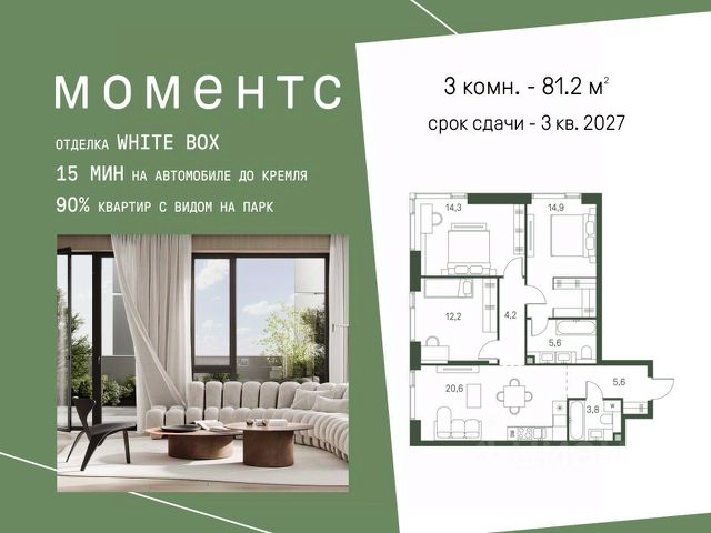 Цены указаны с условием 100% оплаты и стандартной ипотеки. Продается 3-к. квартира номер 723 общей площадью 81.2 кв.м. на 28-м этаже 40 этажного дома, корпус 2.3. С отделкой White Box. МОМЕНТС — ЖК бизнес-класса, расположен на расстоянии вытянутой руки от старинного усадебного парка Покровское-Стрешнево. МОМЕНТС — это единение города и природы, дом, который помогает обрести гармонию и баланс в жизни. МОМЕНТС расположен на Волоколамском шоссе с удобным выездом в центр и в область, а также с расположенными в пешей доступности объектами транспортной инфраструктуры (МЦК и МЦД-2). Жилой комплекс будет состоять из 3 очередей — 8 корпусов высотой от 4 до 47 этажей. Здания будут расположены под разными углами для максимальной открытости солнцу и максимально роскошным видовым характеристикам. Внутренний двор: Иммерсивное благоустройство от британского бюро Gillespies и West8 сфокусировано на эмоциональном и чувственном опыте. Каждая прогулка по Moments погружает в путешествие со сменой сценариев и плавным потоком уникальных моментов. - Пешеходная экотропа,которая соединяет комплекс с парком Покровское-Стрешнево - Двор с фонтаном - Зеленые сады и лаунж-зоны - Пространства для пикников и общения - Зоны активного отдыха. Детские и спортивные площадки - Пешеходные тропы и велодорожки - Разнообразная коммерческая инфраструктура - Детский сад на 175 мест - Школа на 300 мест - Игровые площадки из натуральных материалов - Сенсорные сады - Безбарьерное зонирование