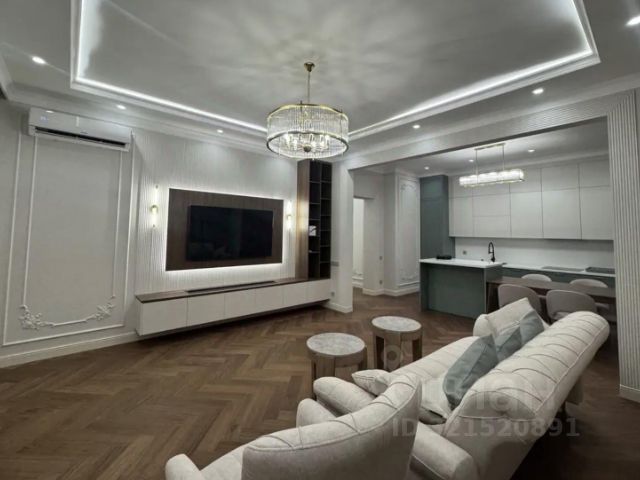 Функциональная планировка апартамента, разработанная по индивидуальному дизайн-проекту: просторная кухня-гостиная, две изолированные спальни, санузел с ванной и душем, гардеробная комната. В каждой зоне оборудованы места для хранения. Кухонная зона плавно перетекает в гостиную, где расположилась ТВ-зона.