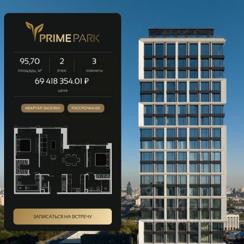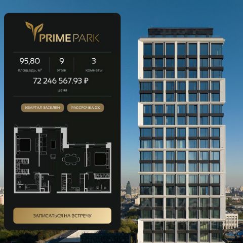 Жилой квартал Prime Park воплощает все преимущества premium-living. Престижная локация на Ленинградском проспекте, 37: - 5 мин. от Тверской улицы, Патриарших прудов и Белой площади, - 20 мин. до аэропорта "Шереметьево" или "Москва-Сити", - 4 парка — Ходынское поле, Петровский и Чапаевский парки, Березовая роща, - 4 станции метро — "ЦСКА", "Аэропорт", "Динамо" и "Петровский парк". Многократный победитель премий European Property Awards и Urban Awards, а также на протяжении пяти лет остается самым продаваемым проектом в своем сегменте. Premium-living Консьержи предугадывают желания резидентов и берут на себя выполнение практически любых бытовых задач. В квартале также есть парк-рейнджер и охрана. Для дополнительного удобства в МОПах предусмотрены почтовые комнаты, колясочные и комнаты для мытья лап домашних питомцев, комната для хранения интернет-заказов. Наличие сервисного входа для персонала позволяет разделить трафик, сохраняя приватную атмосферу в лобби. Резидентам нужно открыть только одну дверь, чтобы оказаться дома: valet-парковщики открывают дверь автомобиля и отвозят его на подземный паркинг, беллмены открывают двери при входе в башню и помогают донести вещи до квартиры, интеллектуальная система обеспечивает бесконтактный вызов лифта. Развитая инфраструктура Близость к центру Москвы, рядом крупнейший ТЦ "Авиапарк", ВТБ Арена, Мегаспорт, ВЭБ Арена, в окружении красивейших парков, включая ультрасовременный Ходынский парк площадью 25 га с панорамными качелями, набережной, фонтанами, детскими и спортивными площадками. На территории квартала предусмотрены приватный фитнес-центр с 25-метровым бассейном и спа, подземный паркинг с кладовыми, местами для хранения велосипедов, электрозарядками и детейлинг-центром для обслуживания автомобилей. На первых этажах башен расположатся кафе и рестораны, цветочный магазин, аптека, салон красоты, премиальный супермаркет и бытовые сервисы. Частный парк Общее парковое пространство квартала — 5,5 га, из них 3 га отведено под частный парк эксклюзивно для резидентов. Большой фонтан, аллеи для прогулок, крупномерные деревья, арт-инсталляции, водные глади, детские площадки и воркаут-зона создают гармоничное сочетание жизни на природе со всеми преимуществами мегаполиса. Уникальная квартирография Более 80 вариантов планировочных решений от однокомнатных квартир до двухуровневых дуплексов и пентхаусов. Панорамные окна, высокие потолки, мастер-спальни, балконы и террасы создают особенный комфорт и уют. Авторская архитектура и дизайн Четыре башни сданы, ключи выдаются в день сделки, 2 башни на этапе строительства, сдача в 2023 и 2024 гг. Уникальный архитектурный ансамбль и ландшафтный дизайн, благородные и ценные материалы в оформлении лобби, предметы искусства, арт-объекты и элементы декора, выполненные на заказ специально для Prime Park, становятся отражением яркой индивидуальности резидентов квартала. Продается 3-комнатная квартира в ЖК Прайм Парк в Москве.