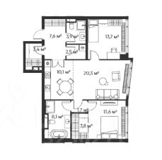 Одна большая спальня 16.5 кв.м и кухня-гостиная 31 кв. м, ванная 5.5 кв.м.