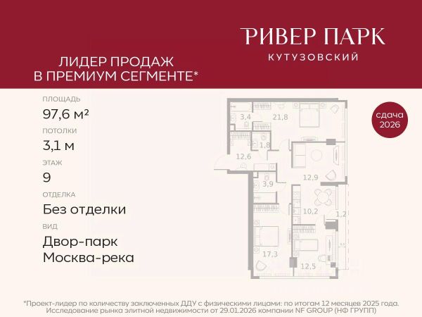 Продается 3-к квартира площадью 89.3 кв.м. на 30-м этаже в жилом комплексе премиум-класса Ривер Парк Кутузовский в Башне Янтарь Премиальный жилой комплекс Ривер Парк Кутузовский строится в одном из самых престижных районов столицы Дорогомилово, на берегу Москвы-реки с лучшими видами на Москва-Сити. Яркий проект в стиле эко-футуризма станет самым масштабным и самым высотным ЖК в локации Кутузовского проспекта. Расположение и Транспортная доступность: • На берегу Москвы-реки, напротив Москва-Сити • 600 метров до Кутузовского проспекта • Удобный съезд с ТТК • Прямой выезд на МКАД по Проспекту Багратиона. • В пешей доступности 3 станции метро: Фили, Парк Победы, Кутузовская, а также станция МЦД Фили. Архитектура от именитого бюро ADM отличается уникальной пластикой фасадов - башни словно парят в воздухе, играя гранями как драгоценные камни. Жилой комплекс состоит из 5-ти небоскребов с приватным парком 2 Га и внешней торговой галереей с открытым доступом. В закрытом внутреннем дворе уникальная по насыщенности клубная инфраструктура только для жителей: • Площадка Мультиспорт (баскетбол, футбол, воллейбол, большой теннис) • Детский игровой клуб Немо • Музыкальная студия • Клуб Гедонист с бильярдной • Студия стиля для стилистов и массажа • Гольф-симулятор • Караоке Впервые в Москве лаунж-зоны на крыше небоскребов, только для жителей: • Всесезонные беседки иглу • Джакузи • Гриль • Площадка для занятий йогой • Самые высоки качели на крыше в России • Видовые площадки Благоустройство комплекса занимает 3 гектара и разработано мировым экспертом по городским парковым ландшафтам - голландским бюро WEST8. Концепция проекта дать жителям отдохнуть от городского ритма и расслабиться среди природы. В Приватном парке уже высажены хвойные деревья-крупномеры сосны и ели. • Зеркальный пруд с арт-объектом • Две детские площадки • Точка спорта с тренажерами и турниками • Цветущий сад • Зеленый театр со сценой и проектором • Видовая зона отдыха с очагом • Солнечная терраса с лежаками На территории жилого комплекса планируется строительство коммерческого образовательного центра, включающего детский сад на 200 мест и школу на 460 мест.