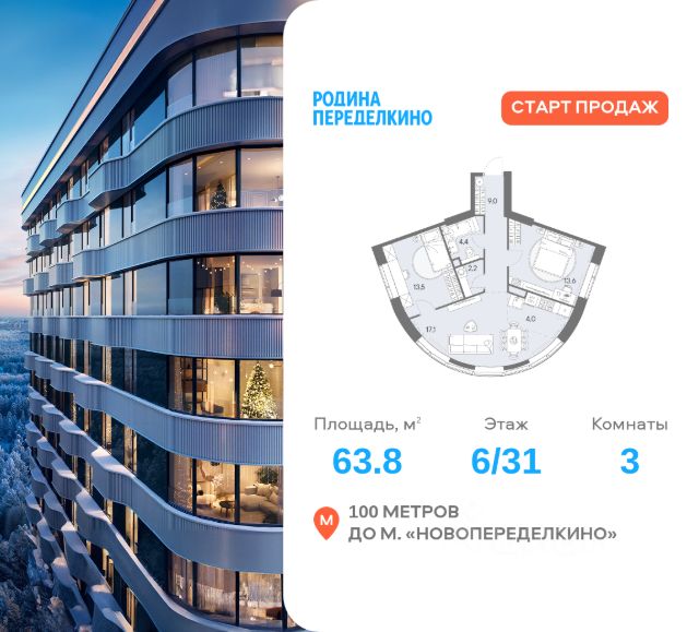 Продаётся 3-комнатная квартира площадью 72.8 м² на 20 этаже в Жилом Комплексе "Родина Переделкино". Первый в России киберспортивный кластер от Группы Родина. Это жилой квартал бизнес-класса на Западе Москвы на границе с Ульяновским лесопарком, состоящий из пяти высотных зданий с подземной одноуровневой автостоянкой. В жилом комплексе широкий выбор вариантов жилья — от компактных студий до просторных 5-комнатных квартир. Помимо комфортных европланировок, представлены уникальные форматы: квартиры с панорамными гостиными, квартиры с террасами на 2 этаже. Преимущества расположения: • 3 минуты пешком до метро "Новопеределкино" • Лесные массивы - чоботовский лес, ульяновский лесопарк и мещерский природный парк. • Прямой выезд на Боровское Шоссе • 30 минут транспортом до делового центра Москва - Сити • 10 минут на машине до аэропорта "Внуково" Развитая инфраструктура: • 5 жилых корпусов • Деловой центр с Welness и SPA • Мультиарена с развлекательным digital - центром • Гастроулица: кофейни, рестораны, стритфуды