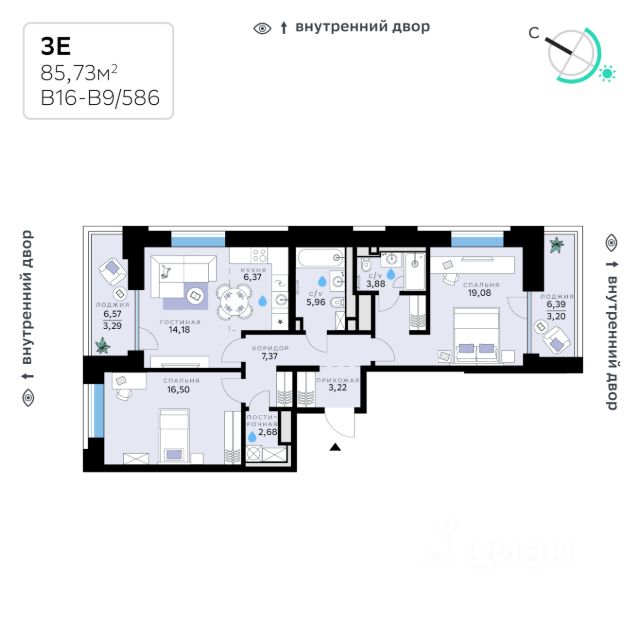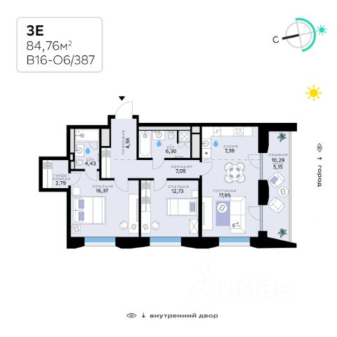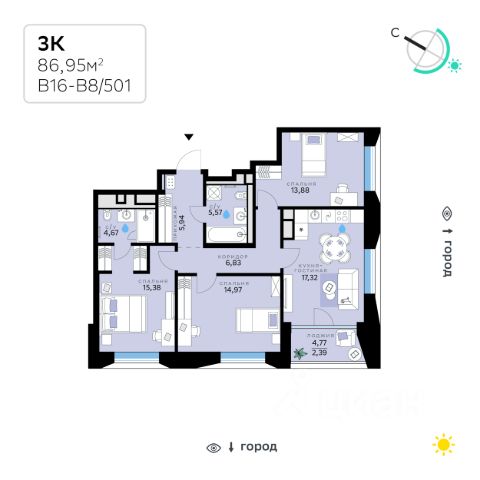 В продаже — двухкомнатная квартира, общей площадью 86,14 кв. м. Квартира расположена на четвертом этаже десятиэтажного корпуса Балансд в квартале В16 нового района СберСити, который строит Сбер. Архитектуру квартала В16 создало итальянское бюро ARCHEA middle east: каждый дом узнаваем, но вместе они складываются в спокойный, цельный ансамбль. В облицовке сочетаются тёплые оттенки кирпича и металла, за счёт игры фактур фасады выглядят живыми и меняются в разное время дня. Строгая геометрия поддерживает ритм города, а мягкая природная палитра помогает чувствовать себя дома, а не в деловом квартале. Дом возводится по технологии монолитного строительства. Квартиры передаются без отделки, что позволяет будущим владельцам реализовать собственные дизайнерские решения и индивидуальные планировки. В квартирах предустановлена система "умный дом", объединяющая управление квартирой, домом и прилегающей территорией. Можно регулировать климат и освещение голосом или через смартфон. Высота потолков — от 3,12 м. Квартал состоит из девяти домов средней этажности — от 7 до 10 этажей. Корпуса формируют большой внутренний двор площадью два гектара. Во дворе предусмотрены зоны для разных сценариев: просторные площадки для детей, пространства для активного досуга и спорта, тихие места для отдыха и спокойного времени, а также удобные рабочие места под открытым небом. Здесь легко найти своё — для жизни, здоровья и занятий тем, что действительно нравится. В доме предусмотрены: уютное лобби с зоной ожидания, лапомойка, санузел, помещение для хранения колясок и велосипедов, подземный паркинг. СберСити — это новый жилой и деловой район на западе Москвы, в одном из самых экологически чистых и престижных мест столицы. Это первая в России и крупнейшая в мире инновационная городская среда, созданная по международным стандартам зелёного проектирования. Здесь внедряются решения в области энергоснабжения, вакуумного мусороудаления, тестирования зелёных технологий, а в дальнейшем — системы искусственного интеллекта для управления домами и городской инфраструктурой. Строительство проекта началось в 2021 году, заселение первых корпусов — с лета 2024-го. Общая площадь территории — 461 га, из них более 2,5 млн кв. м жилья и около 833 тыс. кв. м офисных пространств. Будет построено 7 школ, 13 детских садов и 2 поликлиники. В СберСити будут жить 65 тыс. человек и работать 70 тыс. Развитием территории занимается АО "Рублёво-Архангельское", входящее в группу Сбер. СберСити — место, где хочется жить, работать и растить детей. Переезжайте в СберСити!