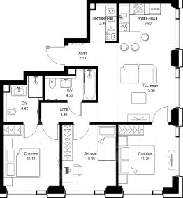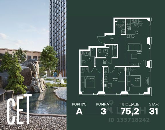 Прямая продажа от застройщика. В ЖК Сет продается 3-комнатная квартира площадью 75.18 м², расположенная в корпусе А, на 28 этаже 52 этажного дома. Сет имеет стратегически выгодное расположение в ЗАО, в районе с большой историей и блестящим будущим: между природной зоной долины реки Сетунь и Кутузовским проспектом. В рамках возведения первой очереди предусмотрено три корпуса высотой 18, 45 и 59 этажей. На верхних этажах спроектированы общедоступные смотровые площадки с панорамным обзором на центр столицы. Преимущества проекта: • Функциональные планировочные решения • Контроль проникновения через входную дверь • Система управления освещением и температурой в квартире • Система защиты от протечек с функцией перекрытия воды • Вход в подъезд по биометрическим считывателям Face ID • Скоростные лифты • Двухуровневый подземный охраняемый паркинг на 495 машино-мест Застройка Сет включает в себя не только жилые корпуса, но и инфраструктурные объекты. Все необходимое для повседневного комфорта будет расположено в шаговой доступности: • Фитнес-Клуб с бассейном • Ведущая городская школа, детский сад и школа искусств • Центр культуры и досуга • Медицинский центр • Кафе и рестораны Расположение комплекса: Пешком: • Метро "Давыдково" - 17 минут • Парк "Долина реки Сетунь" - 3 минуты • Открытие новых станций метро в шаговой доступности в будущем Инфраструктура: Разнообразить свой день резиденты Веер смогут также проводя больше времени на свежем воздухе. Двор разделен на 4 зоны разных эмоций и действий, которые пересечены и соединены веерными прогулочными маршрутами: • Спортивная площадка устроена в глубине "Кленовой рощи" • В "Чайном домике" будет создан навес с утеплением для отдыха в любую погоду • Площадки для детей воплотятся в "Волшебный лес" с цветами, зеркалами и световым дизайном • "Центральная площадь" устроена у водного оазиса живописного пруда. На машине: • "Москва-Сити" - 15 минут • Садовое кольцо - 20 минут • ТЦ "Океания" - 8 минут • ТЦ "Времена года" - 13 минут • Сколково - 12 минут • Гребной канал - 17 минут Компания MR предлагает своим клиентам специальные условия приобретения квартир в рамках программ ипотечного кредитования от банков-партнеров.