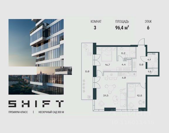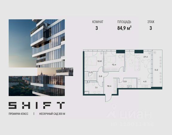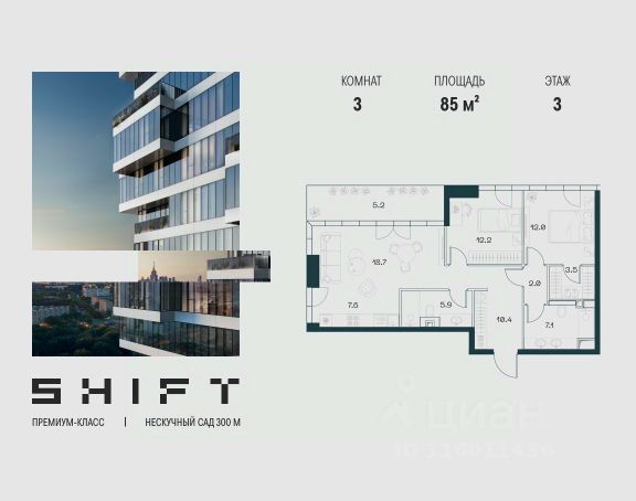 3-к квартира в премиальном комплексе SHIFT на 7-м этаже в 18 этажном здании. Общая площадь 117.4 кв. м. SHIFT - новый премиальный проект от девелопера PIONEER в Донском районе, в 300 м от Нескучного сада. Главная особенность проекта - 5 башен, в которых воплощен принцип модульной архитектуры: каждый этаж смещен относительно предыдущего, что создает эффект парящих в воздухе граней. Архитектура SHIFT создана самым востребованным бюро Москвы - "Цимайло Ляшенко и Партнеры". У жилого квартала удобное расположение: Ленинский проспект ведет прямо к Садовому кольцу и в центр, а быстрый выезд на ТТК станет ключом к любому району Москвы. Многообразие сервисов и коммерческих помещений создает в SHIFT всю необходимую инфраструктуру: кафе и рестораны, street retail, супермаркет и многое другое. Преимущества проекта: - Потолки от 3,65 м - Панорамные окна и террасы - Приватный ландшафтный двор-парк 4 000 м2 - Коммерческая инфраструктура 4 000 м2 - Клубная инфраструктура 350 м2 Девелопер: За 24 года на рынке недвижимости компания PIONEER реализовала более 30 проектов. Сегодня PIONEER - девелопер премиальной недвижимости с 4 проектами класса премиум и deluxe. Звоните, и мы с удовольствием расскажем все подробности о проекте и условиях покупки. Продажа от застройщика. Покупка доступна в ипотеку.