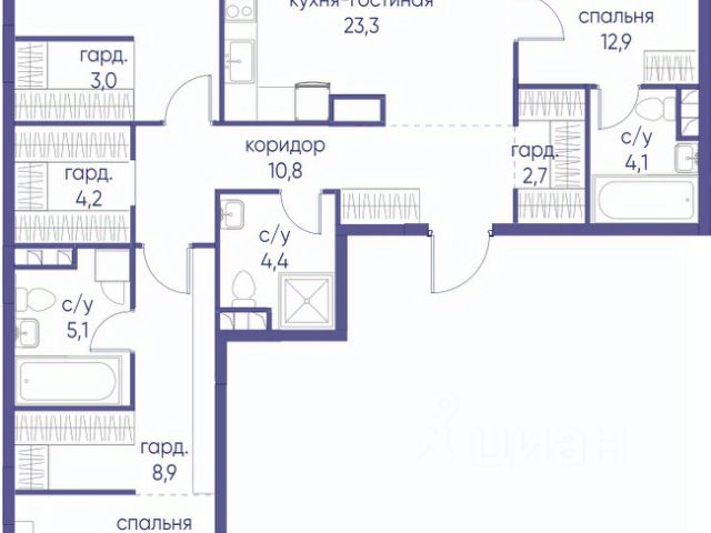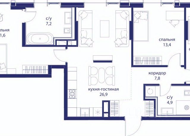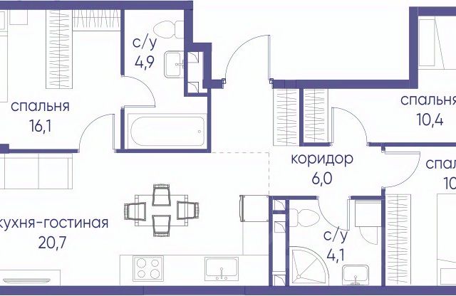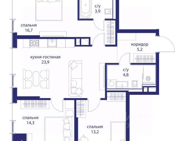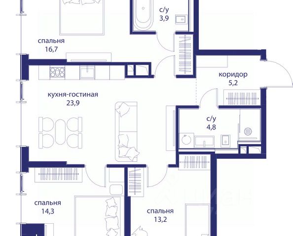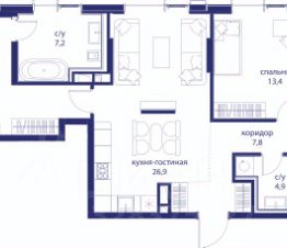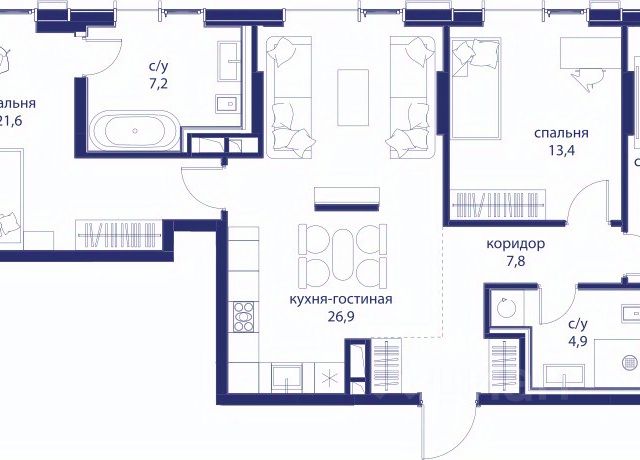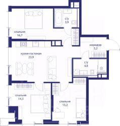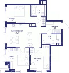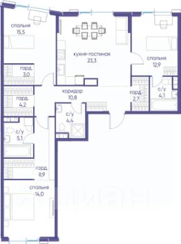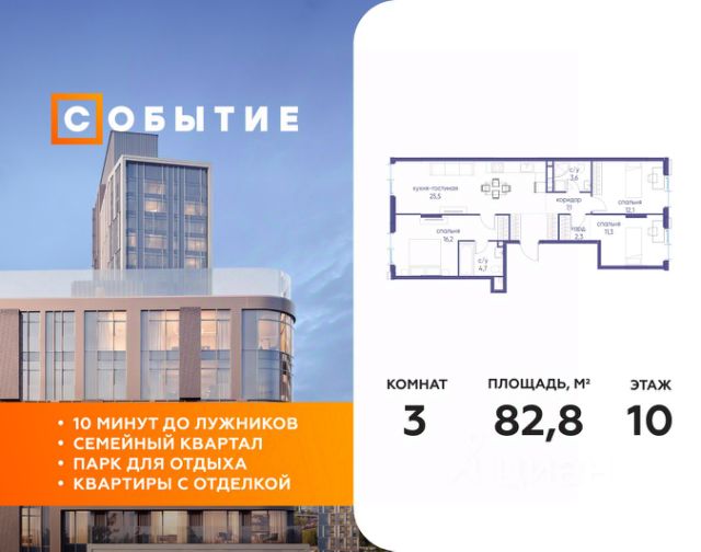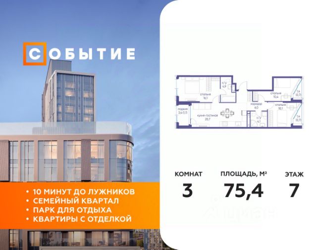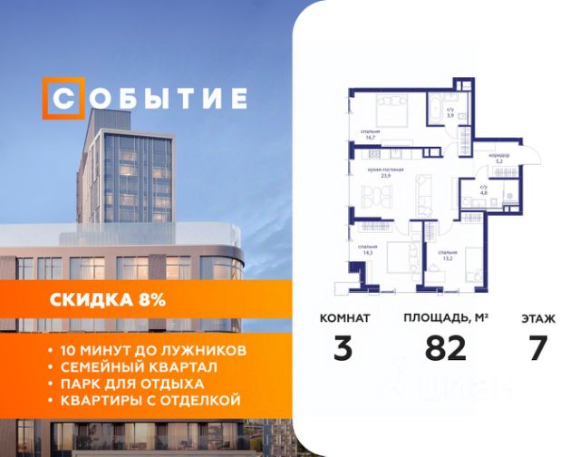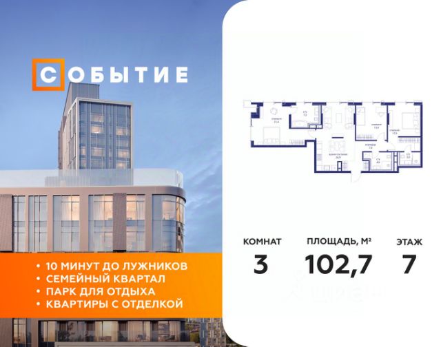 В продаже 3-к квартира от застройщика. Общая площадь 76.00, жилая 37.00, кухня 20.9. Квартира расположена на 7 этаже жилого квартала "Событие-6", корпус 2, Секция 4. Квартира без отделки. Срок сдачи: 4 кв. 2029 года. СОБЫТИЕ.6 — финальный дом парк-квартала СОБЫТИЕ на Мосфильмовской. Переезжайте в уже сформированный квартал с готовой инфраструктурой и парком! Премиальный жилой комплекс в престижном районе Москвы предлагает стильную архитектуру, продуманное благоустройство и великолепно разнообразие общественных пространств. Свой парк прямо возле дома! Архитектура Архитектура СОБЫТИЯ.6 выполнена в ультрасовременном стиле московским бюро Atrium на основе дизайн-кода британских архитекторов LDA Design и UHA London. Дом отличает оригинальная геометрия фасадов, большое остекление и высокие лобби (до 6,2 м) с авторской мебелью и светильниками. Расположение Мосфильмовская улица (Раменки) — один из престижных районов Москвы. Близость к историческому и деловому центру, природным зонам Запада столицы. Транспортная доступность: • 10 мин до Москва-Сити и ТТК; • 15 мин до Садового кольца; • 25 мин до аэропорта Внуково; • 7-10 мин до станций метро "Аминьевская" и "Мичуринский проспект". Инфраструктура: • парк "Событие" (12 га, финалист конкурса Правительства Москвы) с беговыми (1,5 км) и велодорожками (2,7 км), экотропой (1,6 км), площадками, лекторием; • школа, детский сад, магазины, салоны красоты, рестораны (к моменту заселения); • мультидвор с игровыми и спортивными площадками, мини-бульваром; • общественная терраса на 10-м этаже (коворкинг, лаунж); • Закрытые общественные пространства: детская комната, спортивный зал, коворкинг, лаунж-зоны. Паркинг 256 мест для жителей (48 — для электромобилей), 24 гостевых (5 — для электромобилей), мойки колес, кладовые, зоны для велосипедов. Окружение Парки и заповедники (Воробьёвы горы, Матвеевский лес и др.), МГУ, театр им. Н. И. Сац, стадион "Лужники". Безопасность Видеонаблюдение, контроль доступа, видеодомофоны, консьерж-сервис 24/7, системы пожарной безопасности и мультисервисная оптическая сеть. Продается 3-комнатная квартира 3-комнатных квартир в Событие в Москве.