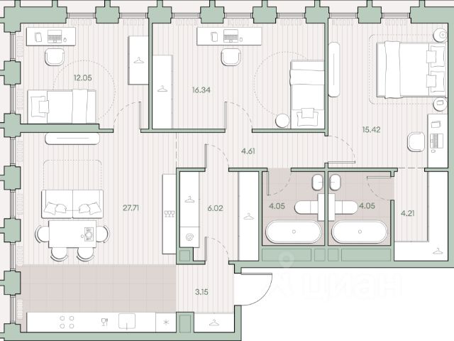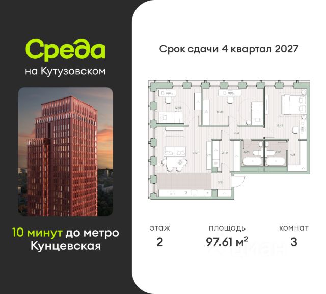 О квартире Продаётся 3-комнатная квартира общей площадью 85.61 кв.м. без отделки. Квартира расположена на 7 этаже корпуса 4.2 в жилом комплексе бизнес-класса "Среда на Кутузовском" в пешей доступности от метро "Кунцевская". О жилом комплексе Комплекс предназначен для людей, которые ставят в приоритет свой комфорт, умеют прислушиваться к себе и понимают, что нужно для внутренней гармонии. Это проект для тех, кто ценит свое время и использует его правильно. Для тех, кто умеет радоваться тому, что есть. "Среда на Кутузовском" — личное место силы и гармонии в двух шагах от центра города. Инфраструктура Жилой комплекс строится в престижном и зеленом Кунцево. Здесь расположены различные торговые центры, престижные учебные заведения (МГУ, РЭУ им. Плеханова, Финансовый университет при Правительстве РФ, РУДН) медицинские клиники. Представлены широкие возможности для поклонников разных видов спорта: от бега в ближайших парках и велозаездов до гребли, баскетбола, футбола, хоккея, фигурного катания и катания на лыжах. На каждый день подойдет World Class с открытым бассейном — он находится всего в 1 минуте от дома. Выбор мест для прогулок также разнообразен: Суворовский парк, лесной массив Крылатских холмов, Москворецкий парк и природный заказник "Долина реки Сетунь". 10 мин пешком: -м. Кунцевская -вся необходимая инфраструктура До 15 мин на авто: -Северо-Западная хорда -Кутузовский проспект -Рублевское шоссе -МКАД -Можайское шоссе Особенности Проект сочетает в себе ритмичность и динамичность, благодаря своей архитектуре, при он этом окружен зеленью и парками. "Среда на Кутузовском" погружает в активный и разнообразный образ жизни, дает вариативные возможности досуга и вдохновляет на новые свершения. —Зоны отдыха у воды —Принцип многослойности в архитектуре —Зона барбекю —Пентхаусы —Умный паркинг —Гайдбук по управлению умным домом —Окна в пол на всех этажах