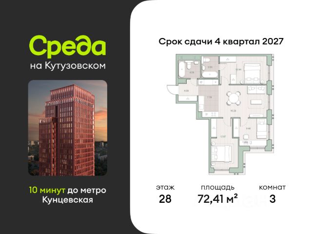 О квартире Продаётся трехкомнатная квартира общей площадью 83.17 кв. м. с отделкой на выбор: черновая, White Box. Квартира на 27 этаже корпуса 4.1 в жилом комплексе бизнес-класса "Среда на Кутузовском". До метро "Кунцевская" 10 минут пешком. Исторический зелёный район "Среда на Кутузовском" строится в Кунцево - историческом и экологически чистом районе Москвы. Здесь нет крупных производств, много лесных массивов и роза ветров, которая обеспечивает приток чистого воздуха. Район наполнен жизнью и уже развит: много детских садов и школ, поликлиники, магазины, кафе, спортивные объекты, парки. - 10 минут пешком до станции метро "Кунцевская". - 5-8 минут на машине до Кутузовского проспекта и Можайского шоссе и 10-15 минут до Рублёвского и МКАД. - 15 минут езды до Крылатских холмов, Суворовского парка и заказника "Долина реки Сетунь". Акции и спецпредложения - Выгода 12%: если внести 100% оплату или оформить семейную ипотеку под 6%. Действует до 13 апреля. - Низкие ставки по ипотеке: 0,1% в первый год или 0,11% в первые два года кредита. - Трейд-ин от "Среды": можно обменять свою текущую квартиру на новую. - Ипотека для семей с детьми: если ребёнку до 7 лет, предлагаем льготную ставку 3,5% О жилом комплексе "Среда на Кутузовском" - новый квартал с башнями от 12 до 44 этажей, окружённый лесными массивами и историческими усадьбами старой Москвы. Во внутреннем дворе есть водоём, многоуровневые зоны с детскими и спортивными площадками, коворкинг на свежем воздухе и локации для уединённого отдыха. Особенности - Архитектура с многослойными фасадами. - Квартиры с террасами и мастер-спальнями. - Окна в пол на всех этажах. - Общественные лаунж-гостиные. - Собственный ландшафтный парк во дворе. - Зоны барбекю и площадки для отдыха у воды. - Умный подземный паркинг. - Стрит-ритейл на первых этажах.