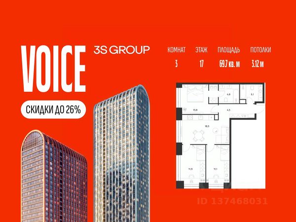 Ипотека от 3,5% на весь срок. Дополнительная скидка в офисе продаж! Продается уютная 3-комн. квартира площадью 69,7 кв.м на 12 этаже жилого комплекса бизнес-класса Войс. Общая площадь: 69,7 кв.м., жилая: 50,6 кв.м., площадь кухни-гостиной: 18,5 кв.м., высокие потолки: 3,12 м., санузел совмещенный. О проекте: Войс. Высокие стандарты жизни Мы уверены, что высокие идеалы неизменно помогают достигать высот. Создавая Войс, мы ориентировались на людей с высокими требованиями к качеству и безупречным вкусом. Башни жилого комплекса, сочетают элегантную форму с динамичной геометрией фасадов, устремляются ввысь и отвечают самым высоким стандартам строительства. Технологичность, воплощенная в архитектуре - это ваш, собственный Войс. Преимущества локации Близость к метро Текстильщики, БКЛ и МЦК Новохохловская (10 мин) Рядом природный заповедник и конно-спортивная база Кузьминки-Люблино Будущее окружение Проект Южный порт - Текстильщики с деловым центром Сити-2 Небоскребы высотой до 300м Культурный центр с амфитеатром Променад вдоль Москвы-реки и яхт-клуб Архитектура Проект от Архитектурной мастерской Алексея Ильина Две перпендикулярные башни с арочными вершинами Высокая башня: светло-серый металл Низкая башня: терракотовая керамика Благоустройство Внешняя зона: парковки, магазины, кафе Внутренний двор: закрытая территория с озеленением Шумозащитный экран Сезонное озеленение Встречи на высоте Гранд-лобби высотой 8м Дизайнерская мебель Умные скоростные лифты Услуги Детский центр с игровой зоной Фитнес-студия для жителей