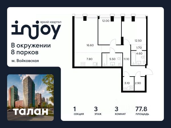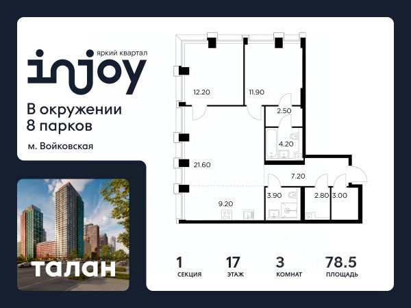 Прямая продажа от застройщика. В жилом квартале, расположенном в Войковском районе Москвы, продаётся 3-комнатная квартира площадью 85.2 кв.м без отделки. Квартира расположена на 12 этаже 35-этажного дома, корпус 1, в жилом квартале бизнес-класса INJOY. INJOY отделен от Ленинградского шоссе исторической застройкой и расположен всего в одном километре от магистрали: это возможность быстро добраться до центра или в любой район города по МКАДу или ТТК. Для автомобилей в INJOY — удобный подземный паркинг с доступом на лифте. Здесь же расположены кладовые площадью от 2,1 до 9 кв. м. Усилители сотового сигнала в лифтах и паркинге позволяют вести важные разговоры, не прерываясь на полуслове. Десятки мест отдыха вокруг INJOY дарят детям и взрослым запоминающиеся развлечения в любую погоду: от прогулок по паркам и природным зонам до интересного досуга в кругу семьи или друзей. 10 минут до парка Покровское-Стрешнево 12 минут до усадьбы Михалково 15 минут до Химкинского водохранилища 7 минут до ТРЦ "Метрополис" INJOY расположен в развитом сформировавшемся районе, что обеспечивает жителям обширную инфраструктуру в пешей доступности. МЦК "Балтийская" - 200 м Ленинградское шоссе - 1 км м. Войковская - 1 км ТТК - 7 км В проекте INJOY три очереди, разновидность которых формирует силуэт живого мегаполиса. Архитекторы международного бюро AI Studio придали индивидуальность каждому корпусу, чтобы все уголки INJOY обрели особенный характер. Планировки и форматы квартир уникальны: пентхаусы, квартиры с террасами, мастер-спальнями, выходом на променад, угловым остеклением, лоджиями, гардеробными, кладовыми и постирочными. Внутренний двор INJOY продолжает общую концепцию благоустройства и включает в себя: три детские площадки для разных возрастов, зону work-out, природную озеленённую зону, променад с зонами для релакса, йоги и амфитеатром с арт-объектами. Закрытый двор, видеонаблюдение и контроль доступа обеспечивают безопасность каждому жителю комплекса. Стоимость квартиры - 39570200 Р. Срок сдачи - 1 квартал 2027. Более подробную информацию по объекту уточняйте по телефону и в отделе продаж.