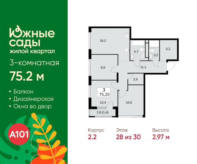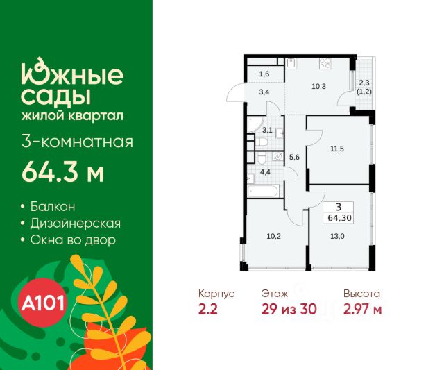 Продается трехкомнатная квартира 57 в новостройке ЖК "Южные Сады" по адресу Москва, ЮЗАО, Южное Бутово, Жилой комплекс "Южные Сады", корп. 2.1. Общая площадь квартиры - 101.30 кв. м., этаж 16 из 16, секция 1. Тип проекта, по которому построен дом - монолит, компания-застройщик - ООО "А101". Стоимость квартиры - 41314192 Р. "Южные сады" на юго-западе Москвы - это жилой комплекс монолитных домов с авторской архитектурой, холлами в средиземноморском стиле, колясочными, современными лифтами, паркингом и кладовыми. Южную атмосферу в районе создадут: - перголы с вьющимися растениями, живые изгороди, садовые дорожки - цветущие, плодовые и вечнозелёные растения - стилизация под средиземноморский ландшафт - амфитеатр и игровой кластер со скалодромом. За безопасность "отвечают" закрытые дворы без машин с доступом только для жителей дома, видеонаблюдение, вход по магнитным ключам. Рядом ландшафтный парк "Южное Бутово", Черневские пруды: театры, танцплощадка, крытые беседки, детские и спортивные комплексы, пикниковые зоны, пешеходные дорожки, деревянные настилы. На первых этажах домов: супермаркеты, кафе, банки, фитнес, пекарни. В пешей доступности - торговые центры, гипермаркет, ФОК, действующая инфраструктура. Для семей с детьми - кружки, секции, детские клубы,центры развития, языковые школы. Преимущества "Южных садов": - атмосферное "средиземноморское" благоустройство - 3 станции метро: "Бунинская аллея", "Улица Горчакова", "Новомосковская" - в пределах 1,6 км - в окружении - развитая инфраструктура обжитой локации - в пешей доступности - Бутовский лесопарк