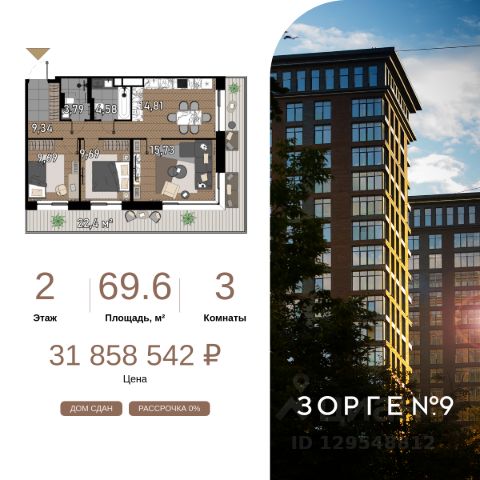 "Зорге 9" — готовые апартаменты бизнес-класса на Ходынке. 10 минут до Москва-Сити. Архитектура: 3 современных корпуса с фасадами в стиле архитектуры Нью-Йорка и с сервисами премиальных отелей, высотой до 23 этажа. Строгие линии, панорамные окна создают ощущение неподдельной роскоши и комфортной жизни в сердце мегаполиса. Проект награжден авторитетной премией European Property Awards. Резиденции: Свободная планировка, небольшая глубина этажа, огромные панорамные окна в пол до 3,6 м и высота потолков до от 3,3 до 4,3 м позволяют реализовать самые смелые концептуальные идеи и создать идеальный интерьер с учетом всех пожеланий. Вдохновляющие виды на город украсят ваш апартамент лучше любой картины. Есть возможность приобретения дизайн-проекта и полной меблировки апартаментов от партнеров девелопера. Расположение: 3 мин. пешком до парка Березовая роща 10 мин. пешком до Ходынского поля 10 мин. до ТЦ Авиапарк 30 минут до Шереметьево 10 мин до Москва-Сити или 1 станция до Москва-Сити 5 минут до ТТК 4 станции метро в шаговой доступности: 6 мин м. Полежаевская (фиолетовая ветка) 7 мин МЦК Зорге (МЦК) 7 мин м. Хорошевская (голубая ветка) 10 мин МЦК Хорошёво (МЦК) Благоустройство: Собственный парк 2 га с амфитеатром и поющими фонтанами. В парке высажено 136 деревьев и более 11 000 кустов и мелких растений из немецких питомников. Площадка для йоги и воркаут-зона со спортивными площадками. Теннисные столы и детский плейхаб Две башни Авторское гранд-лобби В лобби предусмотрена лаундж-зона, чайная с камином, комната для хранения велосипедов и колясок. Доступ по системе FACE ID. В отделке лобби и лифтовых холлов использован декоративный камень итальянского бренда Atlas Concorde Пентхаусы На верхнем уровне комплекса расположены роскошные просторные пентхаусы с высотой потолка до 4,2 метра и панорамными окнами до 3,6 метров, открывающими великолепные виды на столицу. Пентхаусы с выходами на собственные приватные террасы на кровле, площадью от 150 кв. м являются жильем high-уровня, демонстрирующим высокий статус владельца. Продается 3-комнатная квартира 3-комнатных квартир в Зорге 9 в Москве.