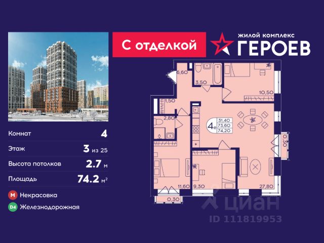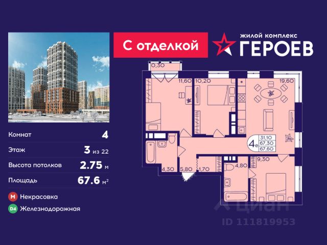 Продаётся 4-комнатная квартира 66.2 кв. м. в жилом комплексе "Героев" в Балашихе, Железнодорожный. Квартира расположена на 25 этаже 611 корпуса. Все квартиры представлены с чистовой отделкой. Вам не нужно тратить время и дополнительные финансы на ремонт или жить в шуме строительных работ - достаточно перевести свои вещи, расставить мебель и всё готово! Жилой квартал "Героев" - это уютный проект для семей с детьми. Всего 40 минут до центра Москвы. В квартале созданы все условия для досуга всех возрастов: игровые и спортивные площадки, места для отдыха и прогулок, магазины, кафе и пункты выдачи. За 15 минут можно дойти от дома до Ольгинского лесопарка - популярного места для прогулок и отдыха на свежем воздухе. Здесь приятно гулять всей семьёй, заниматься спортом или устроить пикник в выходной день. Преимущества: Квартира с готовой отделкой. Пространство полностью подготовлено для жизни: не нужно тратить время и деньги на ремонт или ждать его окончания. После получения ключей достаточно расставить мебель - и можно сразу заезжать и жить. Продуманные и светлые планировки. Просторные кухни-гостиные создают комфортное пространство для отдыха и встреч с близкими. В квартирах предусмотрены удобные гардеробные, благодаря чему легко поддерживать порядок и не перегружать комнаты шкафами. Увеличенное остекление. Большие окна наполняют квартиру естественным светом в течение всего дня, создавая ощущение простора и уюта, а также визуально расширяя пространство и делая интерьер более воздушным. Пешая доступность до станции Железнодорожная (МЦД-4) - дорога займёт не более 30 минут до центра Москвы: станции метро "Курская", "Площадь Ильича" или ТПУ Нижегородская.