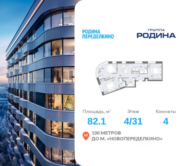 Продаётся 4-комнатная квартира площадью 82.1 м² на 4 этаже в Жилом Комплексе "Родина Переделкино". Первый в России киберспортивный кластер от Группы Родина. Это жилой квартал бизнес-класса на Западе Москвы на границе с Ульяновским лесопарком, состоящий из пяти высотных зданий с подземной одноуровневой автостоянкой. В жилом комплексе широкий выбор вариантов жилья — от компактных студий до просторных 5-комнатных квартир. Помимо комфортных европланировок, представлены уникальные форматы: квартиры с панорамными гостиными, квартиры с террасами на 2 этаже. Преимущества расположения: • 3 минуты пешком до метро "Новопеределкино" • Лесные массивы - чоботовский лес, ульяновский лесопарк и мещерский природный парк. • Прямой выезд на Боровское Шоссе • 30 минут транспортом до делового центра Москва - Сити • 10 минут на машине до аэропорта "Внуково" Развитая инфраструктура: • 5 жилых корпусов • Деловой центр с Welness и SPA • Мультиарена с развлекательным digital - центром • Гастроулица: кофейни, рестораны, стритфуды