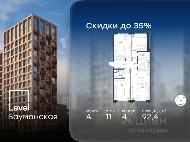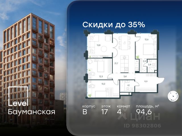 Цена указана с учётом скидки при 100%-й оплате, несубсидированной ипотеке, рассрочке (кроме программы "Рассрочка 0%"). В Басманном районе (ЦАО) продается 4-комнатная квартира площадью 96.10 кв.м без отделки. Квартира расположена на 15 этаже 17-этажного корпуса " B" в жилом комплексе бизнес-класса Level Бауманская (компания Level Group). Отличная транспортная доступность: - 15 мин. пешком до метро "Бауманская" и "Электрозаводская"; - 4 мин. на авто до ТТК; - 8 мин. на авто до Садового кольца; - 15 мин. на авто до Кремля. Продуманный архитектурный проект: - Архитектура от бюро ARCH(E)TYPE, вдохновленная историей района; - 95% квартир с панорамными видами на набережные, парки и сталинские высотки; - Высокие потолки от 3,02 м до 6,3 м; - Лобби с комфортными лаунж-зонами; - Благоустроенный закрытый двор без машин. Расположение и инфраструктура: Level Бауманская расположен в престижном Басманном районе (ЦАО). В пешей доступности находится легендарный МГТУ им. Баумана, Британский и Ломоносовский лицеи, а за 10 минут на автомобиле можно доехать до НИУ ВШЭ и других престижных вузов. На территории проекта предусмотрена развитая внутренняя инфраструктура: собственный детский сад и 10 коммерческих помещений на первых этажах домов. Благоустройство: Концепция благоустройства создана в соавторстве с именитым бюро GAFA. На площади 0,35 га расположатся зоны для отдыха, занятий спортом и прогулок. Во дворе для жителей жилого комплекса будет создан коворкинг прямо на свежем воздухе - открытые беседки и Wi-Fi на территории. Атмосферу приватности подчеркнёт обилие растительности - деревья и кустарники займут 50% двора. За счёт большого количества хвойных насаждений территория жилого комплекса будет зелёной круглый год. Инженерия и комфорт: Жители Level Бауманская не зависят от сезонного отключения горячей воды. Для этого в проекте предусмотрены центральные водонагреватели, обеспечивающие комфорт круглый год. Для безопасности созданы следующие системы контроля доступа: круглосуточное видеонаблюдение всех общественных зон (лобби, двор, лифты, паркинг), вызывные панели у входов на закрытую территорию, видеодомофоны с возможностью управления через мобильное приложение, распознавание автомобильных номеров при въезде/выезде в/из паркинга. По заявке собственнику предоставляется возможность просмотра изображения отдельных видеокамер. Лифты: В жилом комплексе устанавливается лифтовое оборудование Sicher Elevator - одного из ведущих производителей с 20-летним опытом и 40 представительствами по всему миру. Кабины от Sicher Elevator отличаются тихим и плавным ходом, особой износостойкостью и современными технологическими и дизайнерскими решениями. Все лифты имеют прямой доступ в паркинг с жилых этажей. В домах также предусмотрен сервисный лифт. Грузоподъёмность лифтов от 450 до 1000 кг, скорость 1,6 м/с.