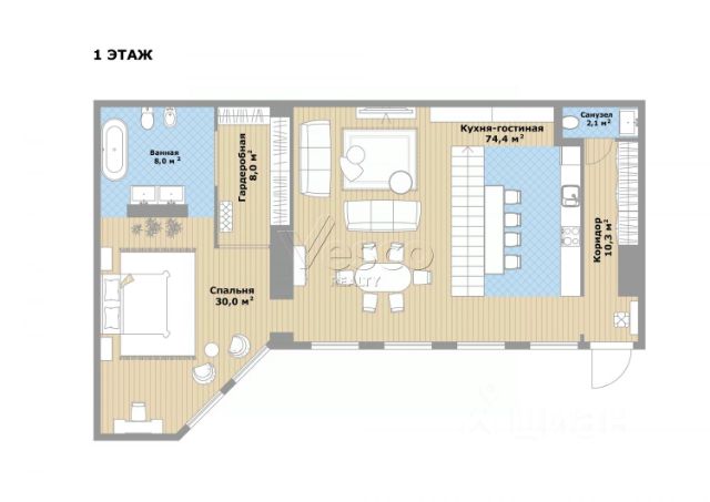 Объединенная кухня-столовая-гостиная (74,4).