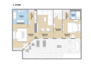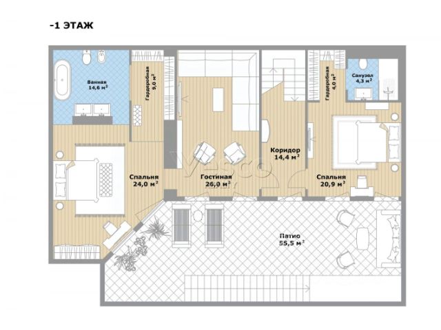 Гостиная (26), патио (55,5). Спальня 1 (24), гардеробная (9), ванная комната (14,6).