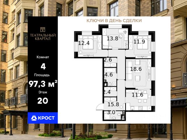 Четырёхкомнатная квартира площадью 107,2 кв.м. на 17 этаже дома бизнес-класса "Трилогия Кристалл". Жилой комплекс Трилогия Кристалл комфорт в сердце Хорошево-Мнёвников Удобное расположение и транспортная доступность CRYSTAL Трилогия расположен в престижном районе Хорошево-Мнёвники, на улице Генерала Глаголева, всего в нескольких минутах от живописного Серебряного бора и набережной Москвы-реки. Из окон открываются панорамные виды на воду и зелёные зоны, создавая ощущение гармонии с природой. Автомобильная доступность • Звенигородское шоссе и проспект Маршала Жукова быстрый выезд в любую часть города. • 7 км до ТТК, 9 км до МКАД, 10 км до Садового кольца. • Общественный транспорт: • Ближайшая станция метро "Народное ополчение" (2 км). Добраться можно пешком или на автобусе. • В пешей доступности строятся 3 новые станции метро, что повысит транспортную связанность района. Инфраструктура: всё для жизни в шаговой доступности Комплекс входит в состав масштабного квартала Union Park (40 га) это современная городская среда с продуманной инфраструктурой. Образование и развитие: • Лучшие школы Москвы: 1515, 1517, 138, Курчатовская школа. • Детские сады: "Wow Kids Серебряный бор", логопедический "ДАРвиль". • Музыкальная школа им. В. В. Андреева. Медицина и спорт: • Поликлиника "Семейный доктор", медцентр "Мед-Лайт", стоматология. • Спорткомплекс "Серебряный" с бассейном, тренажерным залом и солярием. Магазины и рестораны: • Премиальные магазины: "Азбука вкуса", "ВкусВилл", "Лента", "Магнолия". • Рестораны и кафе: Asia Inn, Wells Home Cafe, рыбный ресторан The Mope. Футуристичная архитектура с продуманным комфортом CRYSTAL Трилогия это уникальный дизайн и эргономичные планировки: Внешний облик: • Кристаллическая архитектура с панорамными эркерами и фасадами в оттенках горького шоколада. • Трехуровневая структура, где на верхнем ярусе вы увидите геометрические эркеры с панорамным остеклением, на среднем уровне расположены квартиры с окнами на 1-2 стороны, а на нижнем отделка австрийским клинкерным кирпичом. Внутреннее пространство: • Светлые входные группы с лаунж-зонами для отдыха и мероприятий. • Подземный паркинг (по машиноместу на квартиру) и кладовые для хранения. • Закрытые дворы с спортивными зонами: • Теннисный корт. • Площадки для воркаута. • Беговые дорожки. • Поле для игровых видов спорта. Квартиры с продуманными планировками • 14 комнатные варианты. • Высокие потолки и панорамное остекление для максимальной инсоляции. • Ровные стены и черновая/чистовая отделка на выбор. • Готовые решения для комфортного заезда.