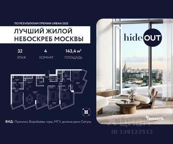 Прямая продажа от застройщика! Продается 4-комнатная квартира площадью 143.4 кв.м. на 6-м этаже 34-этажного дома в жилом комплексе ХАЙДАУТ с панорамными видами: Лужники, Воробьёвы горы, МГУ, долина реки Сетунь. Высота потолков 3,25 м. В проекте действуют привлекательные условия покупки: скидка до 15% при рассрочке на 1,5 года и оплате одним платежом (в том числе ипотека). Предложение действует до 31.03.2026. ХАЙДАУТ — премиальный проект компании Dominanta. Это новый уровень жизни и комфорта без компромиссов. Две башни — 34 и 49 этажей — открывают захватывающие виды на Москву. Архитектурной доминантой проекта становится мост, соединяющий башни на высоте 80 метров. Закрытая территория, охрана 24/7, зона экстренной безопасности на подземном уровне, система пожаротушения. На мосту между башнями на 22-м этаже находится общественное пространство SocialHUB — предусмотрено 16 комфортных пространств для работы, отдыха и развлечений с панорамными видами и клубным форматом доступа. Концепция благоустройства ХАЙДАУТ — баланс между природой и технологичным городом будущего. На территории сада предусмотрены 15 зон для отдыха, работы, спорта и детей. Знаковым местом станет центральная площадь с амфитеатром и водопадом — сочетание камней, растений и струящейся воды создает идеальный баланс с природой. Застройщик АО "СЗ "ХАЙДАУТ", ИНН 7729058636, ОГРН 1027739319420. Проектная декларация на сайте наш.дом.рф. Предложение не является публичной офертой.