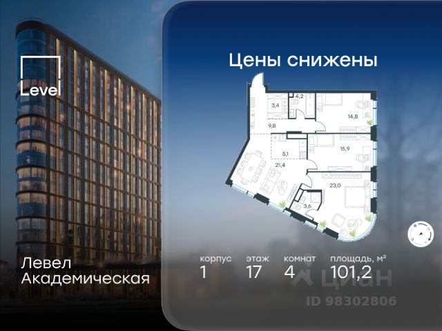 Цена указана с учётом скидки при 100%-й оплате, несубсидированной ипотеке, рассрочке (кроме программы "Рассрочка 0%"). В Академическом районе продаётся 4-комнатная квартира площадью 122.30 кв.м без отделки. Квартира расположена на 2-м этаже 19-этажного жилого комплекса бизнес-класса Левел Академическая (компания Level Group). Площади помещений определены кадастровым инженером по результатам обмеров. В соответствии с законодательством площадь неотапливаемого помещения не включается в общую площадь. Отличная транспортная доступность: - 1 мин. пешком до станции метро "Академическая"; - 4 мин. на автомобиле до ТТК; - 8 мин. на автомобиле до Садового кольца; - 13 мин. на автомобиле до Кремля. Продуманный архитектурный проект: - современная архитектура от бюро UNK project; - высокие потолки в квартирах до 6,62 м; - окна в пол высотой 2,5-2,68 м с панорамным видом на МГУ, Москва-Сити и другие доминанты Москвы; - квартиры с моллированным остеклением - радиусные окна открывают увеличенный угол обзора; - более 20 вариантов планировочных решений; - уникальные квартиры с собственным патио и возможностью обустройства дровяного камина; - квартиры сдаются без отделки, что открывает свободу для создания интерьера по своему вкусу. Расположение: Камерный проект из 1 корпуса расположен тихом зеленом районе Москвы, в непосредственной близости к центру города. В округе построено 80 детских садов, 50 школ и 30 вузов, 7 из которых входят в топ100 вузов России: МГУ, МГИМО, РАНХиГС, МИСИС, РУДН, РЭУ им. Плеханова и РГУ нефти и газа им. Губкина. Этот район буквально утопает в зелени парков, начиная с уютного Академического в 6 минутах пешком и заканчивая одним из крупнейших в городе парком 50-летия Октября (12 минут на автомобиле). Общая площадь природных объектов в радиусе 2-6 км от дома - 476,5 га. Внутренняя инфраструктура: На территории жилого комплекса Левел Академическая откроется собственный торговый центр, а для отдыха жителей будут созданы общественные пространства: комфортное лобби с дизайнерской отделкой, окнами в пол и потолками высотой 4,5 м, а также две благоустроенные зоны - территория по периметру здания и пространство на стилобате. Во дворе на стилобате предусмотрены детская и спортивная площадки, коворкинг и лаунж-зона на открытом воздухе. Стилобат украсят скульптуры животных - жирафа, зайца и волка, которые станут ярким акцентом внутреннего двора жилого комплекса Левел Академическая, подчеркивая близость к музею Дарвина. Процент озеленения территории - 58%. Технологии и безопасность: Жителей жилого комплекса Левел Академическая не коснется ежегодное отключение горячей воды благодаря собственным центральным водонагревателям. Безопасность гарантирует круглосуточная охрана, безлимитный вайфай, круглосуточное видеонаблюдение. Удобное перемещение внутри комплекса будут обеспечивать 5 лифтов с доступом в паркинг с жилых этажей. п