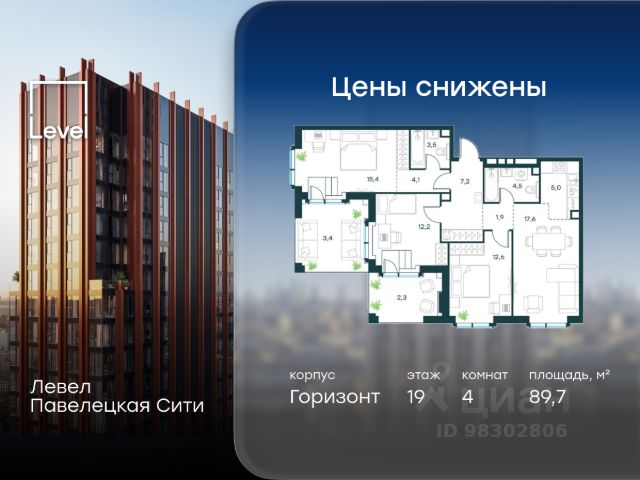 Цена указана с учётом скидки при 100%-й оплате, несубсидированной ипотеке, рассрочке (кроме программы "Рассрочка 0%"). В Даниловском районе столицы (ЮАО) продаётся 4-комнатная квартира площадью 87.70 кв.м без отделки. Квартира расположена на 21 этаже 27-этажного корпуса 14 в жилом комплексе бизнес-класса Левел Павелецкая Сити. Высота потолков 3.00м. Престижная локация Жилой комплекс бизнес-класса Левел Павелецкая Сити расположен в престижном Даниловском районе Москвы - историческом центре города в окружении парков, Москвы-реки и новейшей инфраструктуры. В 20 минутах пешком есть 3 станции метро, а в 5 минутах езды на авто - ТТК и Садовое кольцо. - 15 мин. пешком до метро "Павелецкая"; - 20 мин. пешком до станций "Тульская" и "Серпуховская"; - 8 мин. на авто до Кремля; - 10 мин. на авто до парка Горького и парка "Зарядье"; - 20 мин. на авто до башен "Москва-Сити". Авторская архитектура Авторская архитектура Авторская архитектурная концепция разработана бюро СПИЧ. Облик корпусов этапов 1 и 2 отсылает к стилистике архитектуры классического Нью-Йорка и золотой эпохи Голливуда. Корпуса этапа 4 вдохновлены эстетикой ар-деко. Умное линейное расположение корпусов гарантирует потрясающие виды на исторический центр и Москву-реку из большинства квартир. Дизайнерские лобби Изысканные интерьеры лобби жилого комплекса отсылают к классическим фильмам золотой эпохи Голливуда. Классика в жилом комплексе Левел Павелецкая Сити - не имитация, а современное осмысление лучшего в этом стиле. В каждом вестибюле оборудованы стойки ресепшен, комфортные зоны ожидания, гостевые санузлы, мойки для лап животных, колясочные. В корпусах по 3-4 лифта с прямым доступом в паркинг. Площадь лобби - от 47,9 до 114,9 кв. м, высота потолков - до 5,46 м. Благоустройство и инфраструктура Для создания благоустройства было приглашено 2 ведущих бюро - ADM и GAFA. Разноуровневое пространство вмещает в себя игровые площадки для детей всех возрастов, тропы здоровья для пеших прогулок, крытые аллеи с качелями, места для работы на свежем воздухе, многофункциональные спортивные площадки - зоны уличных тренировок, столы для пинг-понга, зоны командных игр. Общая площадь закрытого двора - 4,63 га. Комфорт - это когда рядом всё, что нужно для жизни. В жилом комплексе Левел Павелецкая Сити размещены 85 коммерческих помещений, где откроются супермаркеты, кафе, аптеки и многое другое. В составе проекта также предусмотрены собственный фитнес-клуб, развивающий центр Летово Кидс. Технологии и безопасность - Вайфай в лобби и на придомовой территории; - Автоматизированная система контроля и учета ресурсов; - Круглосуточное видеонаблюдение и охрана; - Круглосуточная связь с охраной через приложение, телефон или кол-центр; - Контроль доступа по биометрической системе распознавания лица; - Усиленный сотовый сигнал в лифтах и паркинге; - Распознавание номеров автомобилей при въезде/выезде в/из паркинга.