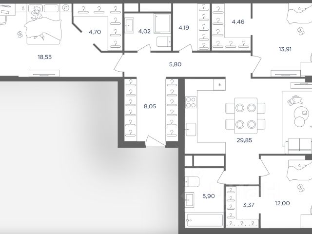 Просторная 4-комнатная квартира с 30-метровой кухней-гостиной. В комплексе представлены единичные варианты таких планировок с панорамным видом в сторону делового центра Москва-Сити, русла Москвы-реки и Парка Победы.