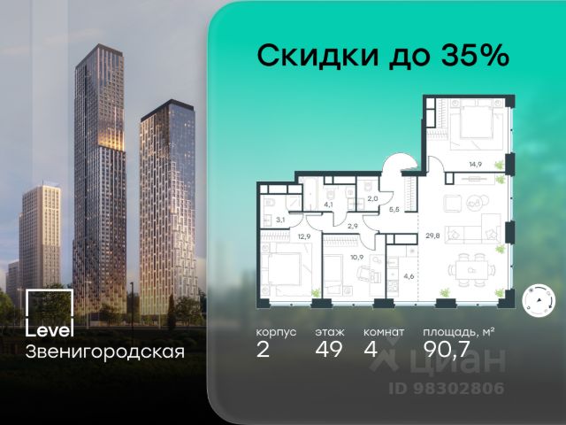 Четырёхкомнатная квартира площадью 117,2 кв. м. на 16 этаже нового дома премиум-класса Высотка на Жукова "Высотка на Жукова" - это современный дом, который олицетворяет дух настоящей Москвы, сочетая в себе величественность архитектуры московского ренессанса, расположение в лесу, современные инженерные решения и премиальный сервис. Высотка расположена в парке, внутри природного комплекса, в районе Хорошёво-Мнёвники, рядом с проспектом Маршала Жукова, всего в 15 минутах от центра Москвы. Дом окружён лесом с четырех сторон, и жизнь в нём сравнима с загородной резиденцией, но в черте города. Стиль и оформление: Монументальный неоклассицизм этой высотки сочетает лучшие черты различных эпох — от античности и барокко до ар-деко. Архитектурные элементы включают ступенчатые аркады, французские балконы и открытые павильоны-бельведеры, украшенные гризайлью, обелисками и изысканными вазами. Современные технологии: Инновационные технологии концерна КРОСТ позволяют использовать долговечные современные материалы, что делает здание не только красивым, но и функциональным. Удобства и инфраструктура: - Инфраструктура дома продумана таким образом, чтобы каждый житель имел возможность сосредоточиться на самом главном — себе и своём здоровье. - На территории квартала появятся физкультурно-оздоровительный комплекс и современный медицинский центр с широким перечнем услуг для поддержания физического здоровья в шаговой доступности. - Консьерж-сервис 24/7; служба Room Service, уборка квартир, химчистка, клининг, мойка окон; уход за животными: выгул, кормление, груминг. - Расположенная вблизи Москвы-реки и Серебряного бора, а также парка Ходынское поле и Берёзовой рощи, "Высотка на Жукова" окружена лесным массивом Октябрьского радиополя, что обеспечивает, пожалуй, лучшую с точки зрения экологии локацию. - Развитая инфраструктура на первом этаже дома позволит наслаждаться каждым днем и получать всё необходимое в границах дома: ресторан от известного московского ресторатора, продуктовый магазин, центр эстетики и другие удобства. - Величественные входные группы с потолками до 7 метров включают: многофункциональную зону коворкинга, двухуровневую библиотеку, лаундж-зоны с камином, просторные колясочные. - Внутренние дворы с зонами для отдыха и детскими площадками, а также паркинги для автомобилей. - Близость к образовательным учреждениям, медицинским учреждениям и торговым центрам, что делает "Высотку на Жукова" идеальным выбором для семей.