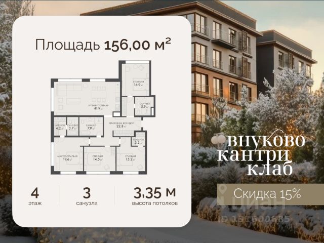 Скидка 15% на ограниченное количество квартир! Продается видовая квартира (площадь - 156.00 кв. м., комнат - 4, этаж 4) в клубном поселке премиум-класса Vnukovo Country Club. Комплекс расположен на Западе Москвы в экологически-чистом районе в окружении Ульяновского и Валуевского лесопарков. 30 Га зеленой территории с ландшафтным дизайном, пешеходными и вело-маршрутами, озером и рекой. На закрытой территории комплекса более 10 объектов собственной инфраструктуры: * Подогреваемый открытый и крытый бассейны; * Многофункциональный спортивный комплекс с более 20 видами спорта; СПА-центр; Школа, детский сад, более 40 различных кружков и секций; Досуговый центр с коворкингом, библиотекой и кинозалом Семейный ресторан VESNA с приватным клабхаусом для работы, отдыха и общения резидентов жилого комплекса * Торговая галерея с премиальным супермаркетом, пекарней, аптекой и химчисткой * Приватный парк с лаунж-зонами и др. Уникальной особенностью комплекса является вертикальное озеленение фасадов и просторные видовые террасы. Квартиры во Vnukovo Country Club предлагаются с различными вариантами отделки и без нее, а также доступна опция полной меблировки - такие квартиры полностью готовы к проживанию. Расположение: * 5 мин. до МЦД-4 "Санино"; * 15 мин. до аэропорта "Внуково"; * 20 мин. до МКАД по Киевскому шоссе; * 35 мин. до "Москва-Сити" За подробной консультацией обращайтесь по телефону.