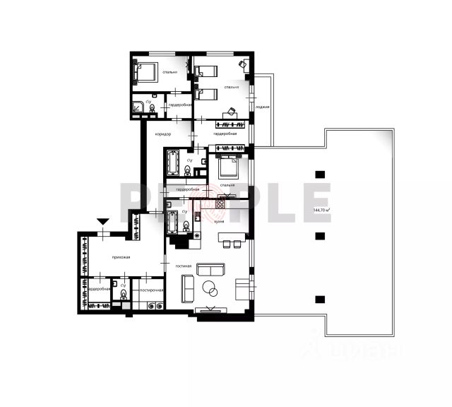 Общая площадь квартиры 105,7 кв.м, квартира зонирована на приватную и общую зоны.