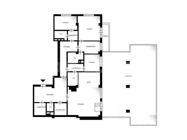 Три изолированные спальни 17,2 кв.м; 13,6 кв.м; 9,6 кв.м, одна с эркером, одна с балконом.