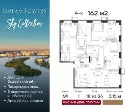 Рассрочка 0% от застройщика. Ключи в день покупки. ЖК Dream Towers проект премиум-класса в окружении парков и набережной, с полностью готовой инфраструктурой для комфортной жизни и отдыха. Продаётся 4-квартира на 18 этаже 24-этажного дома (1 корпус). Общая площадь: 162 кв.м. Высота потолков от 3.15 м. Город-курорт на 100 Га в шаге от вашего дома: - пляжный комлекс Dream Beach Club; - парк аттракционов Остров Мечты; - 44 Га ландшафтных парков; - пешеходная набережная; - яхт-клуб; - Южный речной вокзал; - вейк-парк и многое другое. В Dream Towers предусмотрено все для комфортной жизни с семьей: - дизайнерские лобби с общественной гостиной, колясочной и лапомойками; - охраняемый благоустроенной двор только для жителей; - собственный десткий сад и школа прямо во дворе; - красивая архитектура зданий в стиле Ар-деко; - облицовка фасадов из натурального камня с архитектурной подсветкой; - широкоформатное остекление окон в пол для лучших видовых характеристик на парки и пойму Москвы-реки; - подземный паркинг; - клубный формат проживания; - эргономичные планировки от 40 до 162 м2; - высокие потолки от 3,15 до 4,1 м; - квартиры с террасами; - вся необходимая инфраструктура на первых этажах домов, а также в торговой части тематического парка "Остров Мечты" (рестораны, кафе, супермаркет, магазины, салон красоты, йога-студия и многое другое). Центр рядом: 15 минут до Садового кольца на авто, 20 минут до Сити или Кремля. В 5 минутах прогулочным шагом — станция метро "Технопарк".