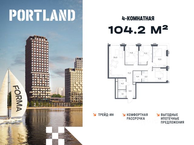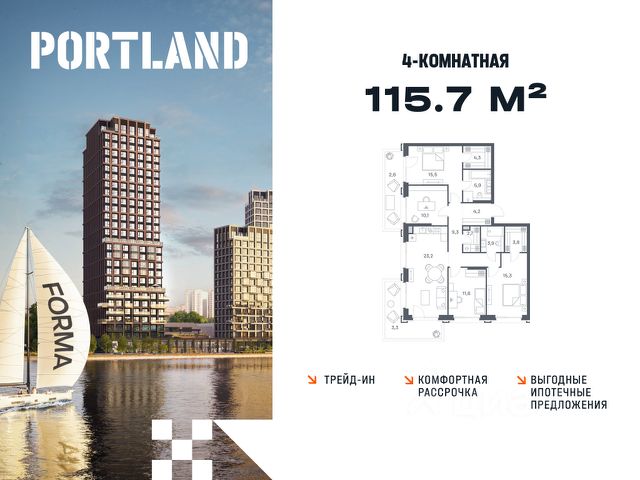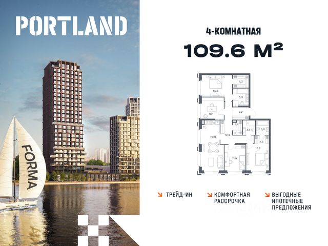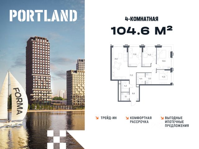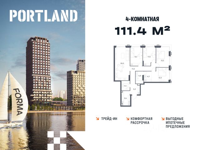 Старт продаж! Продаётся 4-комнатная квартира от застройщика ГК "КОРТРОС" в жилом комплексе бизнес-класса ULTIMAcity. Квартира расположена на 40 этаже 45 этажного корпуса 1. Общая площадь 106,60 м². Без отделки. ULTIMAcity — жилой комплекс бизнес-класса в перспективном районе на юго-востоке Москвы. На его территории появятся 9 башен на 756 этажей, двухуровневый подземный паркинг, собственная инфраструктура, включая детский сад и школу. Всего девелопер благоустроит территорию в 2,6 га. Ближайшая станция метро — "Южный порт". Она откроется в 2028 году и будет находиться в 2-х минутах ходьбы. А прямо напротив расположится остановка водного автобуса-электрохода "Синичка". Дорога от квартала будет удобна и для автомобилистов: - до Кремля — 12 км - до МКАД — 12 км - до выезда на ТТК — 3 км - до Садового кольца — 8 км В двух корпусах первой очереди ULTIMAcity этажностью 45 и 52 реализуется 1 079 квартир с продуманными, рациональными планировочными решениями. В ассортиментной линейке представлены однокомнатные квартиры от 28,2 до 61 кв. м, двухкомнатные лоты от 44,3 до 95,4 кв. м, квартиры с тремя (71 — 115,57 кв. м) и четырьмя спальнями (106,6 — 114,97 кв. м). В экспозиции также есть квартиры с террасами, лоджиями, тремя и четырьмя санузлами, а также с функциональными нишами-кладовыми на кухнях. Запроектированы и эксклюзивные двухуровневые резиденции со вторым светом, в том числе с видом на Москву-реку, площадью от 77,7 до 141,9 кв. м. В рамках проекта запланировано строительство 9 корпусов, школы на 500 учащихся и детского сада на 225 мест. Еще будет создана продуманная инфраструктура для жителей: детские и спортивные площадки, амфитеатр для мероприятий, беседки и теплицы для садоводства, коворкинг, детский клуб и ресторан с открытой террасой. Доступ в жилой комплекс осуществляется по биометрическому контролю - Face ID. Вокруг квартала будет приватная территория с видеонаблюдением и консьерж-сервисом 24/7. Лобби корпусов будут иметь двойные выходы: на улицу и во внутренний закрытый двор.