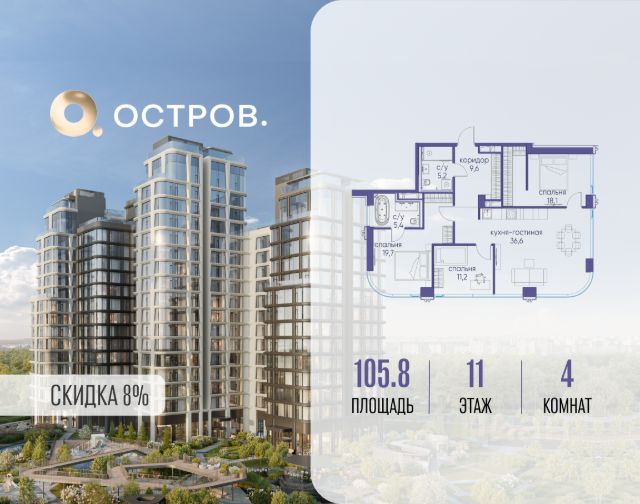 Скидка до 8% действует до 31.03.2026 г. при 100% оплате и не субсидированной ипотеке. Продаётся четырехкомнатная квартира от застройщика: общая площадь 124.90 м², жилая 53.90 м², кухня 35.00 м², 3, жилой квартал "Остров 7", корпус 7 (7 квартал) (секция 2). срок сдачи: 4-кв. 2025. , 3 санузла: 1 раздельный и 2 совмещенных. В жилой зоне 2 больших окна на одну сторону, хорошая инсоляция. Позвоните сейчас и забронируйте квартиру! Купите квартиру в доме у прибрежного парка, в квартале ОСТРОВ.7. Это семь корпусов премиум- и бизнес-класса в одном из лучших мест ОСТРОВА - между бульваром и парком, поблизости от реки. Стильные корпуса имеют узнаваемый вид благодаря бионической пластике фасадов, приподнятых над землей. Для жителей предусмотрены детский клуб, фитнес-рум, коворкинг, переговорные, лаунжи. На крышах устроены видовые общественные пространства с зонами для отдыха и спорта. Двор расположен на двух уровнях: нижний ландшафтный парк и верхняя городская терраса. ОСТРОВ.7 - часть жилого комплекса на западе Москвы, в 15 минутах езды от центра. Это настоящий заповедник посреди большого города, в окружении реки и 650 га заповедников. Здесь все необходимое находится по соседству: от детского сада до супермаркета, от фитнес-зала до серфинг-центра. На территории созданы все условия для отдыха и общения: клубная инфраструктура в домах и дворы-парки, набережные и променады, маршруты для спортсменов, детей и возрастных жителей. В нескольких минутах ходьбы расположена станция метро "Терехово" БКЛ. На автомобиле - 10 минут до Москва-Сити и 15 минут до Садового кольца.