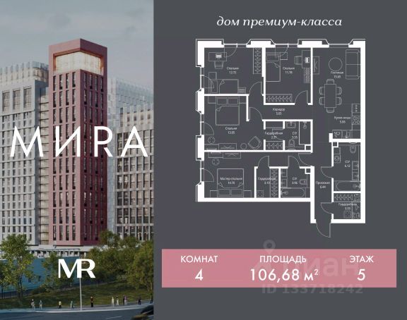 Прямая продажа от застройщика. Продаётся 4-комнатная квартира общей площадью 115.21 м² без отделки в доме премиум-класса МИRА на 15-м этаже 17 этажного дома. Квартира расположена в корпусе 1. Дом премиум-класса МИRA это: • Спокойный район с богатой историей и сложившейся инфраструктурой • Авторская архитектура на стыке классики и современности • Вход в парк прямо из жилого комплекса • Панорамные виды на Яузу, парки, ВДНХ и скульптуру "Рабочий и колхозница" • Удобные сервисы и безопасность для каждого резидента Расположение: Жилой квартал расположен в Алексеевском районе на северо-востоке Москвы, на второй линии домов, таким образом вы сможете дистанцироваться от шума и суеты проспекта Мира, но при этом будете жить недалеко от этой важной городской магистрали. Прямо у дома: • Парк Акведук • Река Яуза • Памятник "Рабочий и колхозница" Пешком: • 16 мин м. ВДНХ На автомобиле: • 12 мин ТТК • 15 мин Садовое кольцо • 12 мин Национальный парк "Лосиный остров" Благоустройство: Концепция благоустройства от бюро "ДРУЖБА" разработана в стиле "Лесная тропа". В уютном дворе расположились словно затерянные в лесу, площадки для отдыха. Они разделяются островками с травами, кустарниками, крупными камнями и деревьями, между которыми проходят узкие песчаные тропинки с деликатной подсветкой по вечерам. Центральной точкой притяжения для жителей станет главная площадь с фонтаном, которая открывается сразу из двух входных групп. Внутренний двор МИRA: • Детская площадка с зонами для игр малышей до трех лет и детей более старшего возраста • Спортивная площадка с профессиональным оборудованием для тренировок • Декоративные перголы • Воздушный арт-объект с подсветкой, похожий на облако • Чайный домик, где в отдельном отапливаемом павильоне можно в любое время года попить кофе с соседями или устроить камерное семейное чаепитие • Зоны для работы и отдыха с гамаком под навесом, скамейками и креслами Инфраструктура и окружение: В Алексеевском районе есть огромные благоустроенные парки, магазины, гимназии с высоким рейтингом и филиалы ВУЗов, частные и государственные детские сады, модные кофейни и фитнес-центры. В квартале МИRА предусмотрены: • 2 ресторана с видом на парк Акведук • 3 кафе • фитнес-студия • подземный паркинг на 330 машино-мест Компания MR предлагает своим клиентам специальные условия приобретения квартир в рамках программ ипотечного кредитования от банков-партнеров. Продается элитная 4-комнатная квартира, жильё рядом с метро ВДНХ.