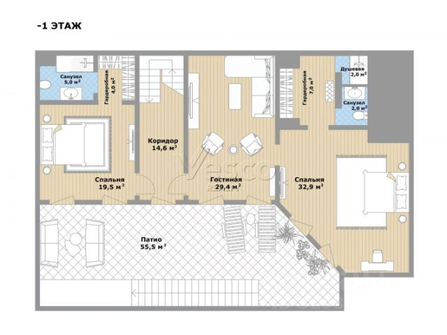 Гостиная (29,4), патио (55,5). Спальня 1 (32,9), гардеробная (7), ванная комната (4).