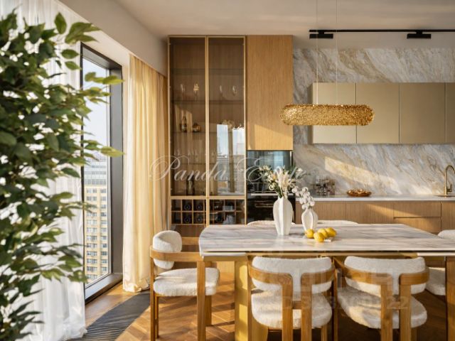 Отделка стен и лифтовых холлов выполнена с применением декоративных элементов из латуни, используются тёмные акцентные элементы. Они прекрасно сочетаются с дизайнерской мебелью, камином и освещением.