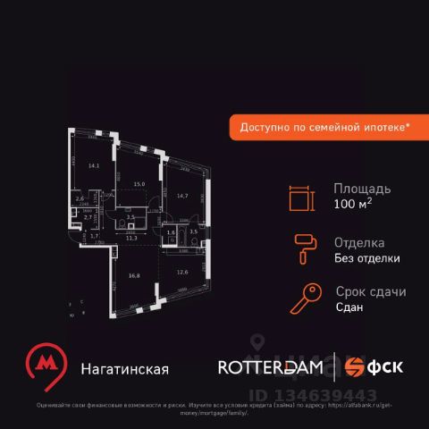 ТОЛЬКО 4 ДНЯ ДО 10.02 • Дополнительная скидка 10% • Ставка 10% по стандартной ипотеке для всех без наценок • Ставка 3,5% по семейной ипотеке Успейте купить выгодно! Прямая продажа от застройщика! Жилой Комплекс бизнес-класса. Продаётся 4-к квартира номер 64 общей площадью 100.1 кв.м. на 10-м этаже 29 этажного здания. Без отделки. Цена с учётом скидки. Особенности квартиры: - Мастер-зона с гардеробной. Просторное место для отдыха и удобного хранения вещей. - Мастер-зона с санузлом. Уют и комфорт в одном пространстве. - Угловая планировка - больше пространства для ваших идей. - Мало квартир на этаже - уединение и тишина. - Окно в ванной - натуральное освещение для уюта и комфорта. - Увеличенная ширина окна/окон - больше света и визуального простора. - Увеличенное количество окон - дополнительное освещение и свежий воздух. - Угловое остекление - свет и воздушность в каждой комнате. - Гостевой санузел - комфорт и удобство для ваших гостей. - Душ помимо ванной - дополнительное удобство для вашей семьи. - Постирочная - организуйте пространство для стирки и сушки вещей. - Гибкая планировка - создайте пространство по своему вкусу. - Место для игры/занятия спортом - идеальное пространство для активных детей. - Просторная мягкая зона - комфорт и уют для отдыха всей семьи. - Возможность добавить спальное место - дополнительный комфорт для гостей. - Гардеробная - удобство для хранения и организации вещей. Информация о комплексе: В ЖК Роттердам отличное расположение, которое позволит вам выбирать свой сегодняшняшний маршрут и транспорт исходя из настроения, целей и погоды. Отсюда удобно добираться в центр как на метро станция находится в пешей доступности, так и на автомобиле. Варшавское шоссе связывает жилой комплекс с ТТК, а через Люсиновскую и Мытную улицы с Садовым кольцом. В качестве альтернативного маршрута можно использовать Нагатинскую набережную: дорога вдоль Москва-реки приведет к Кремлю и Павелецкому вокзалу. Для неспешной поездки предусмотрены трамвайные маршруты, а в теплое время года веломаршруты вдоль реки. Транспортная доступность: Всего в 5 минутах пешком до метро Нагатинская и 8 минутах от МЦК Верхние Котлы. Рядом Аэроэкспресс до метро Домодево. До ТТК 2,2 км и 4,9 км до Садового кольца. Внутренняя инфраструктура: Если вы ищете идеальный баланс между отдыхом и работой и обладаете активной жизненной позицией - ЖК Роттердам вам понравится. В ЖК: зоны коворкинга, плейхаб и детские площадки для отдыха всей семьей. Близость к деловому центру Москвы, в окружении 5 парков, рядом спортивные и развлекательные центры Если вы любите живописные виды и долгие прогулки - ЖК Роттердам - отличный вариант для вас, так как он расположен прямо на Нагатинской набережной с выходом на Москву реку! В ЖК Роттердам соблюден баланс между высоткой и малоэтатажным зданием, которое не потеряло ощущение уюта и не создает впечатление городских джунглей Если вы любите быть на высоте и без ограничений - выбирайте верхние эта