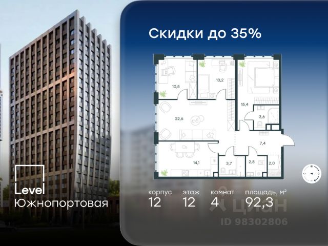 Цена указана с учётом скидки при 100%-й оплате, несубсидированной ипотеке, рассрочке (кроме программы "Рассрочка 0%"). В северной части района Печатники продается 4-комнатная квартира площадью 92.30 кв.м без отделки. Квартира расположена на 12 этаже 20-этажного корпуса 12 в жилом комплексе комфорт-класса Level Южнопортовая (компания Level Group/Левел групп). Отличная транспортная доступность: - 10 мин. пешком до станции метро "Кожуховская"; - 20 мин. пешком до станции МЦК "Дубровка"; - 3 мин. на авто до ТТК; - 13 мин. на авто до Садового кольца; - 15 мин. на авто до Бульварного кольца. Продуманный архитектурный проект: - авторская архитектура от бюро СПИЧ; - уникальные виды на реку, парки и достопримечательности города; - высота потолков в квартирах до 6 м; - окна высотой до 1,87 м с высоким коэффициентом сопротивления теплоотдаче. Расположение: Level Южнопортовая строится в северной части района Печатники - самой приближенной к центру. Здесь будет сформирован новый район "Южный порт", где построят крупный жилой и общественно-деловой центр, аналогичный Москва-Сити. В течение 10-12 лет в этом месте появятся не только жилые дома, но и развитая инфраструктура для жизни и работы. А еще совсем рядом находится набережная Москвы-реки, где планируется построить причалы для речных трамвайчиков и канатную дорогу. Уже сейчас вокруг жилого комплекса работают десятки магазинов и торговых центров, рядом расположено 6 парков, среди которых музей-заповедник "Коломенское". В 10 минутах пешком - 2 муниципальных и 2 частных детских сада, 7 общеобразовательных школ. Внутренняя инфраструктура: Для отдыха жителей в каждом корпусе предусмотрено лобби, оснащенное местами для отдыха, гостевыми санузлами и лапомойками, а в отдельных корпусах - камином. За счёт больших окон и высоких потолков пространства будут наполнены воздухом и светом. На первых этажах жилого комплекса откроются магазины, салоны красоты, фитнес-центр. Для детей строятся собственные детский сад и школа. Благоустройство: Внутренний двор комплекса разработан совместно с бюро GAFA. Основная идея - создать аналог Центрального парка в Нью-Йорке, гармонично сочетая высотные здания и большое изолированное парковое пространство. Вся площадь двора-парка будет огорожена и составит более 2 га, из которых 45% - озеленение. Одним из самых важных ландшафтных элементов здесь станет небольшая речка, наполняющаяся во время дождя. Вокруг неё появится сеть из островов, внутри которых расположатся тематические зоны спорта и отдыха. Технологии и инженерия: - автоматическая передача в управляющую компанию показаний квартирных счётчиков; - телефонная связь, телевидение и интернет на базе оптической мультисервисной сети; - гостевой Wi-Fi в лобби и на территории двора; - единый ключ доступа для входа на территорию комплекса.