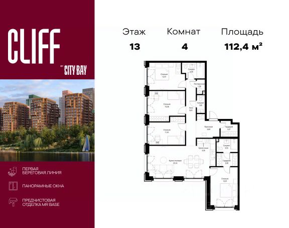 Прямая продажа от застройщика. Продаётся 4-комнатная квартира общей площадью 112.40 м² с предчистовой отделкой в ЖК City Вау, квартале Cliff, на 13-м этаже 15 этажного дома. Cliff by City Вау - это пять клубных домов на первой линии озелененной набережной Реки Москвы. Со стороны южного фасада, обращенного к воде, находится прогулочная зона, организующая входы в жилые секции. Вдоль северного фасада пятой очереди проходит общеквартальный озелененный бульвар с тематическими зонами и дворовыми территориями. В каждой секции предусмотрены сквозные входные группы, а между секциями - проходы для пешеходов, связывающие набережную и бульвар с местами для отдыха внутри квартала. Данное решение позволяет сделать комплекс с доступной и безбарьерной городской средой. Со стороны бульвара у каждой башни для жильцов комплекса расположены приватные потайные дворики, огороженные живой изгородью и интегрированные в общий ландшафт бульвара. Из-за перепадов высот по рельефу, уровень бульвара возвышается относительно уровня дворов, что делает их еще более камерными. Доступ на территорию со стороны бульвара осуществляется через калитку. В каждом здании комбинируется максимальное количество и разнообразие форматов квартир: от видовых квартир с зелеными террасами и лоджиями до квартир малого формата. Входные группы 1-ых этажей поистине уникальные пространства. Лобби имеют высоту потолков 5 - 6 м и панорамные окна. В отделке используются дорогие натуральные материалы:шпон дерева, мрамор, металл и др. Одноуровневый паркинг с дополнительными функциями: - Велопарковка, - Места для подкачки шин, - Зоны погрузки и разгрузки, - Зарядки для электрокаров, - Кладовыми помещениями. Концепция жилого комплекса City Вау - настоящий город в городе с отлично развитой инфраструктурой и собственной благоустроенной набережной. На территории жилого комплекса расположено пять кварталов - Atlantic, Pacific, Indian, North, Cliff. Жилой квартал City Вау отличается оригинальной концепцией и выделяется среди других проектов такими характеристиками как: - Архитектура, - Виды из окон, - Природное окружение, вызывая гордость у жителей и восхищение у прохожих. Вся жизнь района Покровское-Стрешнево строится вокруг водных объектов: - Пойма реки Сходни с уникальной экосистемой, - Речка Химка и Химкинское водохранилище, - Москва-река, - Канал имени Москвы. Кругом вода, и местные с удовольствием этим пользуются. А сразу за рекой - центр водного спорта в Строгино с вейк-парком и яхт-клубами. Помимо воды, здесь очень много зелени: - Рядом Сходненский ковш памятник природы, естественный амфитеатр глубиной 40 метров; - Парк при усадьбе Братцево с фруктовым садом; - Дубовая роща "Маяк", - Алешкинский лес; - Лесопарк Покровское-Стрешнево с пляжами и бобрами. Главные транспортные артерии района: - Волоколамское шоссе, - Таганско-Краснопресненская линия метро и МЦД-2. Всего за 20 минут можно добраться до центра на машине или метро, а МЦД связывает ЖК City Вау