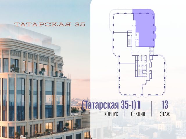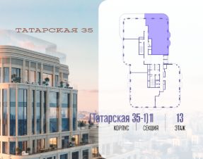 Продается просторная квартира площадью 129.10 м2 в жилом комплексе ТАТАРСКАЯ, 35. Квартира находится в 2 секции корпуса 3. Этаж 13-й из 23. Квартира без чистовой отделки, с просторной кухней 41.00 м2. Жилая площадь 61.30 м2. Высота потолка от 3.50. ТАТАРСКАЯ, 35 - новая архитектурная доминанта Замоскворечья, достопримечательность на фотопанорамах исторического центра Москвы. Элитный дом, созданный для тех, кто умеет смотреть далеко вперед, мыслить масштабно и воплощать собственный сценарий жизни. Вдохновляющие прогулки по променаду набережной, в уютных переулках, в парке "Зарядье", в Михайловском саду и Репинском сквере. Наслаждение высоким искусством в Третьяковской галерее, Доме Музыки, театральном музее им. А.А. Бахрушина, театре на Малой Ордынке. За окнами - Кремль, высотка на Котельнической, панорамы Замоскворечья и острова Балчуг, огни Садового кольца. Собственные спорт-румы, детская, репетиторская, бьюти-пространства, деловое пространство с коворкингом, переговорной и сигарной. Собственный трехуровневый фитнесс-центр с бассейном, тренажерным залом, сауной, хаммамом, массажным кабинетом. Площадь двора - 1,8 га, половина территории покрыта деревьями, кустарниками и лужайками. Дом расположен внутри Садового кольца - отсюда в считанные минуты можно добраться до важнейших мест столицы: достопримечательностей и парков, театров и ресторанов, деловых и административных центров. 7 минут до Кремля на автомобиле, 15 минут до Третьяковской галереи и 8 минут до Садового кольца пешком. Планировочные решения и визуализации предварительны, возможны изменения.