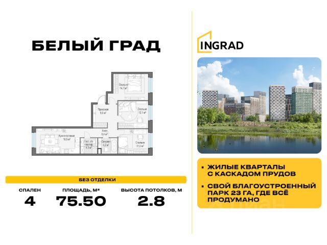 Прямая продажа от девелопера. В жилом квартале комфорт-класса "Белый Град" (девелопер ingrad) продаётся 4-спальная квартира площадью 75.50 кв.м без отделки. Квартира расположена на 14 этаже 20-этажного дома, корпус 12.1. Расположение: "Белый Град" расположен в благоприятном северном направлении Москвы: в комфортной близости ко всем ее возможностям. Вы будете жить в заповедном месте с благородной историей и красивой природой. Исторически у слияния двух рек - Сукромки и Яузы - на возвышении располагалось село Тайнинское. На протяжении веков оно было облюбовано царями и великими князьями. Белокаменный храм, которым вы будете любоваться в окнах своего нового дома, - уникальный памятник русского зодчества. Отличная транспортная доступность: Новый микрорайон находится в 1 км от МКАД и 500 м от Осташковского шоссе. Добраться до столицы можно не только на автомобиле: сеть общественного транспорта в районе квартала активно развивается и дополняется новыми маршрутами: 35 минут до метро "Медведково", 38 минут до ж/д станции "Мытищи". Особенности комплекса и благоустройство: Вы будете жить в заповедном месте с благородной историей на берегу реки Сукромки. Почти 40% площади квартала занимает благоустроенная природная территория. У каждого из трех кварталов своё тематическое наполнение. Функциональная насыщенность территории многообразна: сенсорные площадки и песочницы для малышей, отдельные развивающие игровые зоны для детей от 3 до 5 и от 5 до 11 лет, игровые зоны для подростков. Отдельный парк для тренировки и выгула собак. Зона воркаута с современными тренажерами и многофункциональные спортивные площадки для командных видов спорта, поляны для йоги, навесы с зонами для тихого отдыха, веломаршрут протяженностью более 5 километров. Социальная инфраструктура многогранна: включает 4 детских сада, две школы, поликлинику и физкультурно-оздоровительный комплекс с бассейном, торговый центр и 2 административно-офисных здания. Открытые многоуровневые паркинги по периферии кварталов и паркинг в стилобатной части освободят дворы от машин, велопарковки позволят не заставлять красивые холлы Стоимость квартиры - 16 820 000 Р. Срок сдачи - 3 квартал 2026. Более подробную информацию по объекту уточняйте по телефону и в отделе продаж.