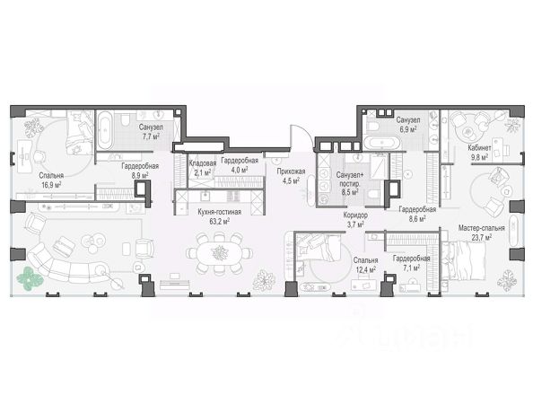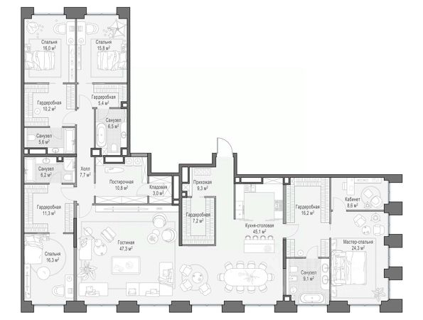 Просторная светлая квартира на две стороны площадью 163,6 кв. м. Оптимальное расположение трёх спален. Из окон кухни-гостиной (52,6 кв. м) открывается вид на панораму города, на высотки в стиле сталинского ампира. Две детские ориентированы в тихий приватный двор-парк с ландшафтным дизайном. В квартире все окна большие, широкие, с возможностью открывания настежь, что дополнительно улучшает видовые характеристики квартиры. Продуманная планировка позволяет разместить три мастер-спальни с отдельными санузлами и гардеробными. Life Time - роскошный современный квартал на Пресне, в наиболее быстро растущем премиальном районе ЦАО. Его насыщенная инфраструктура и выгодное расположение дарят время для жизни. Вы больше не тратите его на дорогу или ожидание, при этом ни в чём себе не отказывая. На территории предусмотрено всё для комфортной жизни: • двор-парк площадью 1,8 гектара с прудом и фонтанами; • Clubhouse - инфраструктурный центр в отдельном здании с исчерпывающими возможностями для спорта, отдыха и досуга только для жителей; • спортивная инфраструктура на улице и в помещении, в том числе бассейн длиной 25 метров, хот-таб, хаммам, сауна, бьюти-зона; • клубная гостиная с террасой; • всё для развития и досуга детей любого возраста, в том числе детский сад и школа. Life Time находится в центре сложившегося премиального района, в окружении многочисленных парков. Удобная транспортная доступность и прямой выезд на Звенигородское шоссе позволяют без проблем добраться до Садового кольца и Москва-Сити. Архитектурный стиль квартала - роскошный минимализм. Дома десятилетиями будут выглядеть современно.