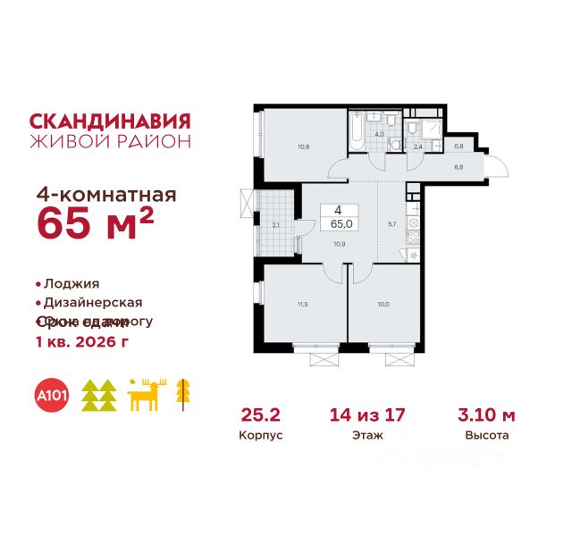 Продается четырехкомнатная квартира 1076 в новостройке Жилой район "Скандинавия" по адресу Москва, ТиНАО, Новомосковский АО, Сосенское С/П, Коммунарка пос., жилой комплекс Скандинавия, 25.7, район Коммунарка, Новомосковский административный округ, Москва. Общая площадь квартиры - 97.60 кв. м., этаж 14 из 17, секция 12. Тип проекта, по которому построен дом - монолит, компания-застройщик - ООО "А101". Стоимость квартиры - 37285152 Р. Срок сдачи - 2 квартал 2026. ПРЕДЛОЖЕНИЯ ОТ ЗАСТРОЙЩИКА В ФЕВРАЛЕ 2026: Скидки до 10% на все квартиры. Только в офисах продаж до 28 февраля. Ипотека от 13,9 % для всех! На весь срок. "Семейная ипотека" вернулась. Ставка от 3,5 % на весь срок! Без удорожания! Выгодное ипотечное комбо: Ипотека от 2200 р./мес. и от 6 % после рождения ребёнка! Ипотека для всех "Держи пять!" - ставка 5 % на 2 года! *более подробную информацию по скидкам и акциям уточняйте в отделе продаж ЖК "Скандинавия" на границе Бутовского лесопарка (1610 га) - это баланс качественного жилья и сервисов, зелёных пространств для активного и созерцательного отдыха. Выразительная архитектура и цветовая гамма монолитных корпусов комфорт- и бизнес-класса (8-17 этажей) созвучны скандинавским мотивам, органично интегрированы в великолепный природный контекст. Огороженные дворы свободны от машин, в них продуманы места для отдыха и работы на свежем воздухе, озеленение, детские и спортивные площадки. Для прогулок, встреч и районных праздников - площадь Туве Янссон с "сухим" фонтаном, вековыми дубами и единственным в мире памятником писательнице; пешеходный променад 2 км; 3 крупных природных ручья; более 15 км велосипедных и прогулочных дорожек с арт-объектами. Инфраструктура района включает современные школы и детские сады, центр впечатлений, фитнес-клубы, развивающие и творческие центры, магазины, кафе, салоны красоты. На подземных этажах - паркинги и кладовые. Преимущества "Скандинавии": - ст. метро "Потапово" - 100 м от ближайших домов (открыта!) - удобные выезды на трассу Солнцево - Бутово - Варшавское шоссе и ул. Бачуринская - свои школы и детские сады - инфраструктура на первых этажах и рядом с домом - лесопарк, природные водоёмы, прогулочные маршруты