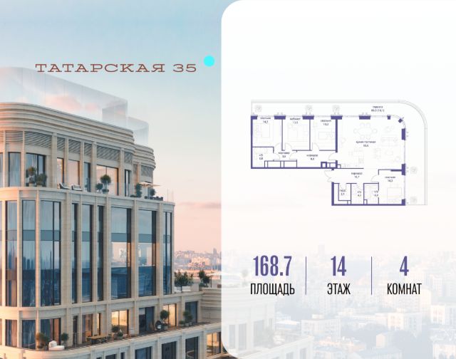 Продается просторная квартира площадью 131.00 м2 в жилом комплексе ТАТАРСКАЯ, 35. Квартира находится в 2 секции корпуса 3. Этаж 14-й из 23. Квартира без чистовой отделки, с просторной кухней 37.90 м2. Жилая площадь 61.30 м2. Высота потолка от 3.50. ТАТАРСКАЯ, 35 - новая архитектурная доминанта Замоскворечья, достопримечательность на фотопанорамах исторического центра Москвы. Элитный дом, созданный для тех, кто умеет смотреть далеко вперед, мыслить масштабно и воплощать собственный сценарий жизни. Вдохновляющие прогулки по променаду набережной, в уютных переулках, в парке "Зарядье", в Михайловском саду и Репинском сквере. Наслаждение высоким искусством в Третьяковской галерее, Доме Музыки, театральном музее им. А.А. Бахрушина, театре на Малой Ордынке. За окнами - Кремль, высотка на Котельнической, панорамы Замоскворечья и острова Балчуг, огни Садового кольца. Собственные спорт-румы, детская, репетиторская, бьюти-пространства, деловое пространство с коворкингом, переговорной и сигарной. Собственный трехуровневый фитнесс-центр с бассейном, тренажерным залом, сауной, хаммамом, массажным кабинетом. Площадь двора - 1,8 га, половина территории покрыта деревьями, кустарниками и лужайками. Дом расположен внутри Садового кольца - отсюда в считанные минуты можно добраться до важнейших мест столицы: достопримечательностей и парков, театров и ресторанов, деловых и административных центров. 7 минут до Кремля на автомобиле, 15 минут до Третьяковской галереи и 8 минут до Садового кольца пешком. Планировочные решения и визуализации предварительны, возможны изменения.