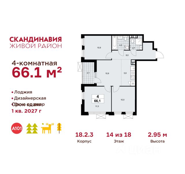 Продается четырехкомнатная квартира 399 в новостройке Жилой район "Скандинавия" по адресу Москва, ТиНАО, Новомосковский АО, Сосенское С/П, Коммунарка пос., жилой комплекс Скандинавия, 18.2.3, район Коммунарка, Новомосковский административный округ, Москва. Общая площадь квартиры - 66.10 кв. м., этаж 14 из 18, секция 5. Тип проекта, по которому построен дом - монолит, компания-застройщик - ООО "А101". Стоимость квартиры - 28315257 Р. Срок сдачи - 1 квартал 2027. ПРЕДЛОЖЕНИЯ ОТ ЗАСТРОЙЩИКА В ФЕВРАЛЕ 2026: Скидки до 10% на все квартиры. Только в офисах продаж до 28 февраля. Ипотека от 13,9 % для всех! На весь срок. "Семейная ипотека" вернулась. Ставка от 3,5 % на весь срок! Без удорожания! Выгодное ипотечное комбо: Ипотека от 2200 р./мес. и от 6 % после рождения ребёнка! Ипотека для всех "Держи пять!" - ставка 5 % на 2 года! *более подробную информацию по скидкам и акциям уточняйте в отделе продаж ЖК "Скандинавия" на границе Бутовского лесопарка (1610 га) - это баланс качественного жилья и сервисов, зелёных пространств для активного и созерцательного отдыха. Выразительная архитектура и цветовая гамма монолитных корпусов комфорт- и бизнес-класса (8-17 этажей) созвучны скандинавским мотивам, органично интегрированы в великолепный природный контекст. Огороженные дворы свободны от машин, в них продуманы места для отдыха и работы на свежем воздухе, озеленение, детские и спортивные площадки. Для прогулок, встреч и районных праздников - площадь Туве Янссон с "сухим" фонтаном, вековыми дубами и единственным в мире памятником писательнице; пешеходный променад 2 км; 3 крупных природных ручья; более 15 км велосипедных и прогулочных дорожек с арт-объектами. Инфраструктура района включает современные школы и детские сады, центр впечатлений, фитнес-клубы, развивающие и творческие центры, магазины, кафе, салоны красоты. На подземных этажах - паркинги и кладовые. Преимущества "Скандинавии": - ст. метро "Потапово" - 100 м от ближайших домов (открыта!) - удобные выезды на трассу Солнцево - Бутово - Варшавское шоссе и ул. Бачуринская - свои школы и детские сады - инфраструктура на первых этажах и рядом с домом - лесопарк, природные водоёмы, прогулочные маршруты
