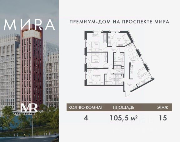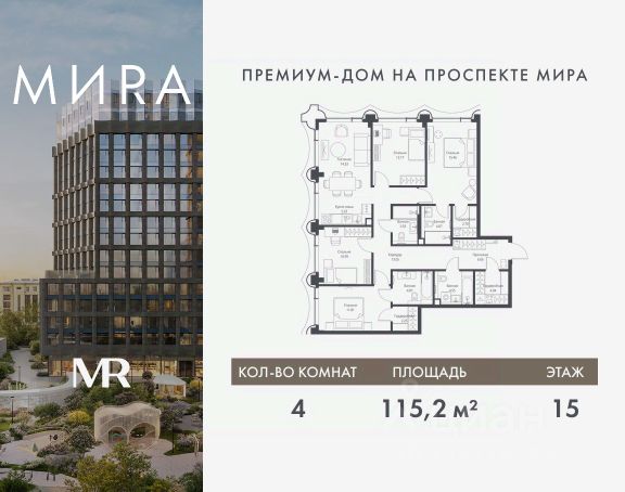 Прямая продажа от застройщика. Продаётся 4-комнатная квартира общей площадью 115.21 м² без отделки в доме премиум-класса МИRА на 15-м этаже 17 этажного дома. Квартира расположена в корпусе 1. Дом премиум-класса МИRA это: • Спокойный район с богатой историей и сложившейся инфраструктурой • Авторская архитектура на стыке классики и современности • Вход в парк прямо из жилого комплекса • Панорамные виды на Яузу, парки, ВДНХ и скульптуру "Рабочий и колхозница" • Удобные сервисы и безопасность для каждого резидента Расположение: Жилой квартал расположен в Алексеевском районе на северо-востоке Москвы, на второй линии домов, таким образом вы сможете дистанцироваться от шума и суеты проспекта Мира, но при этом будете жить недалеко от этой важной городской магистрали. Прямо у дома: • Парк Акведук • Река Яуза • Памятник "Рабочий и колхозница" Пешком: • 16 мин м. ВДНХ На автомобиле: • 12 мин ТТК • 15 мин Садовое кольцо • 12 мин Национальный парк "Лосиный остров" Благоустройство: Концепция благоустройства от бюро "ДРУЖБА" разработана в стиле "Лесная тропа". В уютном дворе расположились словно затерянные в лесу, площадки для отдыха. Они разделяются островками с травами, кустарниками, крупными камнями и деревьями, между которыми проходят узкие песчаные тропинки с деликатной подсветкой по вечерам. Центральной точкой притяжения для жителей станет главная площадь с фонтаном, которая открывается сразу из двух входных групп. Внутренний двор МИRA: • Детская площадка с зонами для игр малышей до трех лет и детей более старшего возраста • Спортивная площадка с профессиональным оборудованием для тренировок • Декоративные перголы • Воздушный арт-объект с подсветкой, похожий на облако • Чайный домик, где в отдельном отапливаемом павильоне можно в любое время года попить кофе с соседями или устроить камерное семейное чаепитие • Зоны для работы и отдыха с гамаком под навесом, скамейками и креслами Инфраструктура и окружение: В Алексеевском районе есть огромные благоустроенные парки, магазины, гимназии с высоким рейтингом и филиалы ВУЗов, частные и государственные детские сады, модные кофейни и фитнес-центры. В квартале МИRА предусмотрены: • 2 ресторана с видом на парк Акведук • 3 кафе • фитнес-студия • подземный паркинг на 330 машино-мест Компания MR предлагает своим клиентам специальные условия приобретения квартир в рамках программ ипотечного кредитования от банков-партнеров.