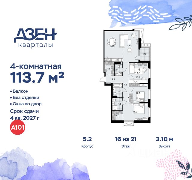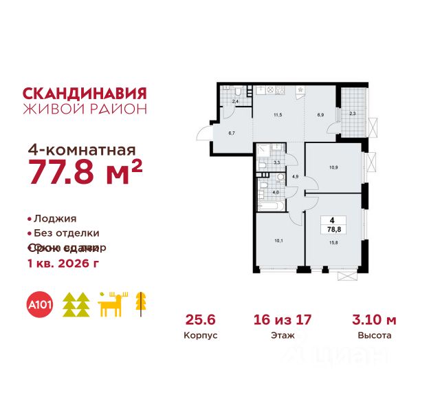 Продается четырехкомнатная квартира 550 в новостройке Жилой район "Скандинавия" по адресу Москва, ТиНАО, Новомосковский АО, Сосенское С/П, Коммунарка пос., жилой комплекс Скандинавия, 28.3, район Коммунарка, Новомосковский административный округ, Москва. Общая площадь квартиры - 101.80 кв. м., этаж 16 из 17, секция 6. Тип проекта, по которому построен дом - монолит, компания-застройщик - ООО "А101". Стоимость квартиры - 39557444 Р. ПРЕДЛОЖЕНИЯ ОТ ЗАСТРОЙЩИКА В ФЕВРАЛЕ 2026: Скидки до 10% на все квартиры. Только в офисах продаж до 28 февраля. Ипотека от 13,9 % для всех! На весь срок. "Семейная ипотека" вернулась. Ставка от 3,5 % на весь срок! Без удорожания! Выгодное ипотечное комбо: Ипотека от 2200 р./мес. и от 6 % после рождения ребёнка! Ипотека для всех "Держи пять!" - ставка 5 % на 2 года! *более подробную информацию по скидкам и акциям уточняйте в отделе продаж ЖК "Скандинавия" на границе Бутовского лесопарка (1610 га) - это баланс качественного жилья и сервисов, зелёных пространств для активного и созерцательного отдыха. Выразительная архитектура и цветовая гамма монолитных корпусов комфорт- и бизнес-класса (8-17 этажей) созвучны скандинавским мотивам, органично интегрированы в великолепный природный контекст. Огороженные дворы свободны от машин, в них продуманы места для отдыха и работы на свежем воздухе, озеленение, детские и спортивные площадки. Для прогулок, встреч и районных праздников - площадь Туве Янссон с "сухим" фонтаном, вековыми дубами и единственным в мире памятником писательнице; пешеходный променад 2 км; 3 крупных природных ручья; более 15 км велосипедных и прогулочных дорожек с арт-объектами. Инфраструктура района включает современные школы и детские сады, центр впечатлений, фитнес-клубы, развивающие и творческие центры, магазины, кафе, салоны красоты. На подземных этажах - паркинги и кладовые. Преимущества "Скандинавии": - ст. метро "Потапово" - 100 м от ближайших домов (открыта!) - удобные выезды на трассу Солнцево - Бутово - Варшавское шоссе и ул. Бачуринская - свои школы и детские сады - инфраструктура на первых этажах и рядом с домом - лесопарк, природные водоёмы, прогулочные маршруты